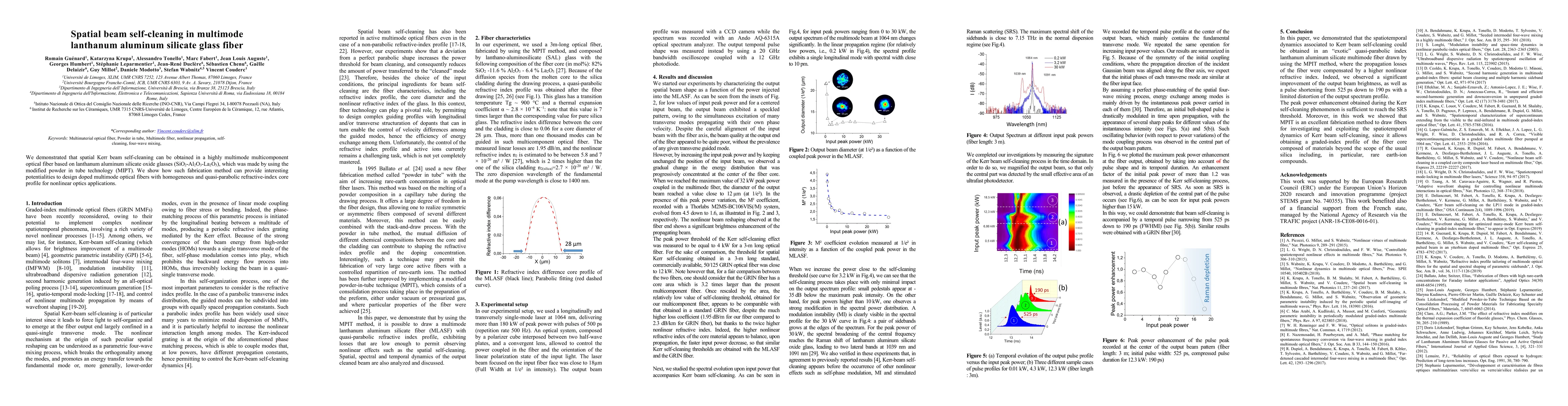 This research demonstrates spatial Kerr beam self-cleaning in multimode lanthanum aluminum silicate glass fibers, fabricated via modified powder in tube technology, showing potential for designing doped optical fibers with homogeneous refractive-index profiles for nonlinear optics applications.