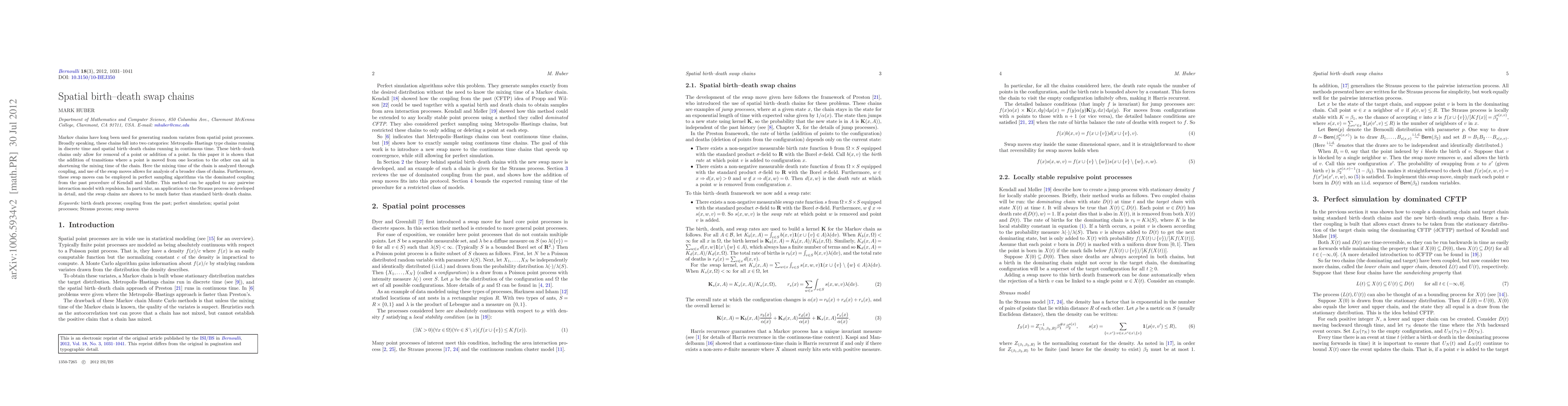 Markov chains have long been used for generating random variates from spatial point processes. Broadly speaking, these chains fall into two categories: Metropolis-Hastings type chains running in discrete time and spatial birth-death chains running in continuous time. These birth-death chains only allow for removal of a point or addition of a point. In this paper it is shown that the addition of transitions where a point is moved from one location to the other can aid in shortening the mixing time of the chain. Here the mixing time of the chain is analyzed through coupling, and use of the swap moves allows for analysis of a broader class of chains. Furthermore, these swap moves can be employed in perfect sampling algorithms via the dominated coupling from the past procedure of Kendall and M{\o}ller. This method can be applied to any pairwise interaction model with repulsion. In particular, an application to the Strauss process is developed in detail, and the swap chains are shown to be much faster than standard birth-death chains.
