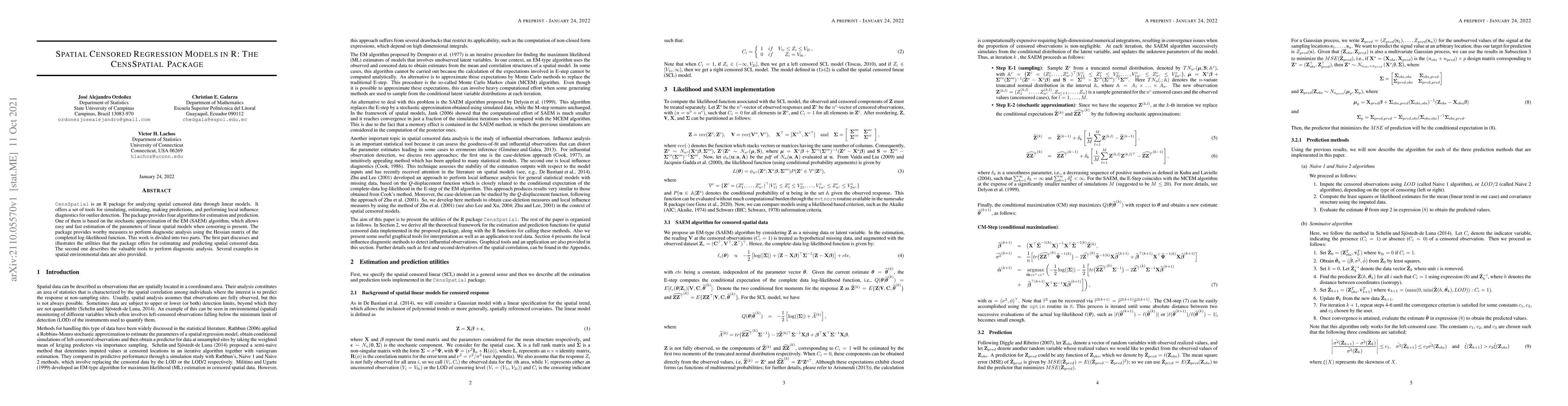 Summary: The CensSpatial R package facilitates the analysis of spatial censored data through linear models, offering tools for simulation, estimation, prediction, and diagnostics. It includes algorithms like the stochastic approximation of the EM (SAEM) algorithm, and provides diagnostic measures using the Hessian matrix, with examples in spatial environmental data.