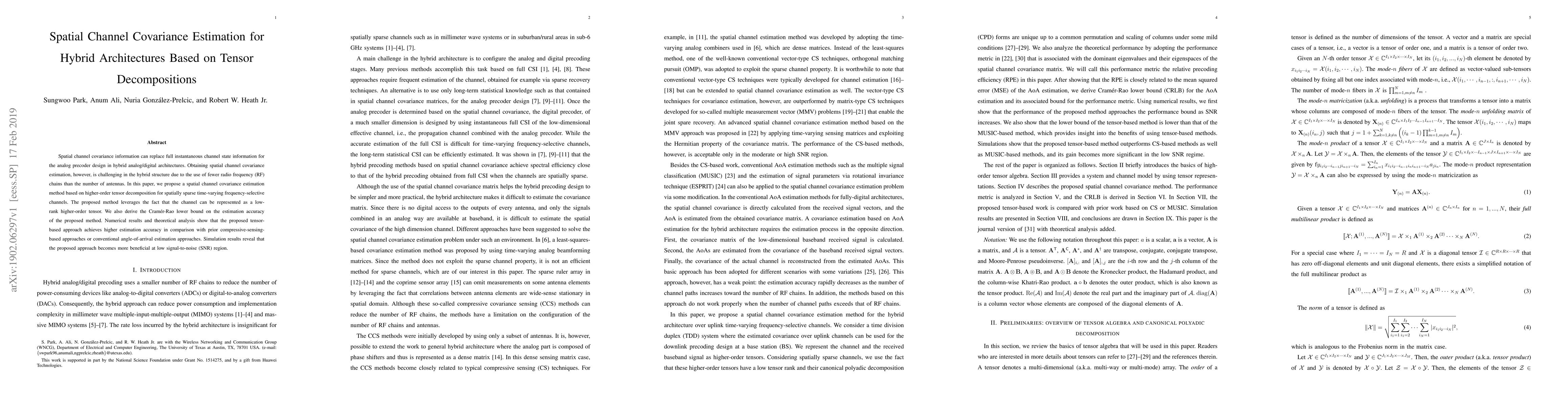 This paper proposes a tensor decomposition-based method for estimating spatial channel covariance in hybrid analog/digital architectures, which is more accurate than prior compressive-sensing and angle-of-arrival estimation methods, especially at low signal-to-noise ratios. The method leverages the low-rank structure of the channel represented as a higher-order tensor.