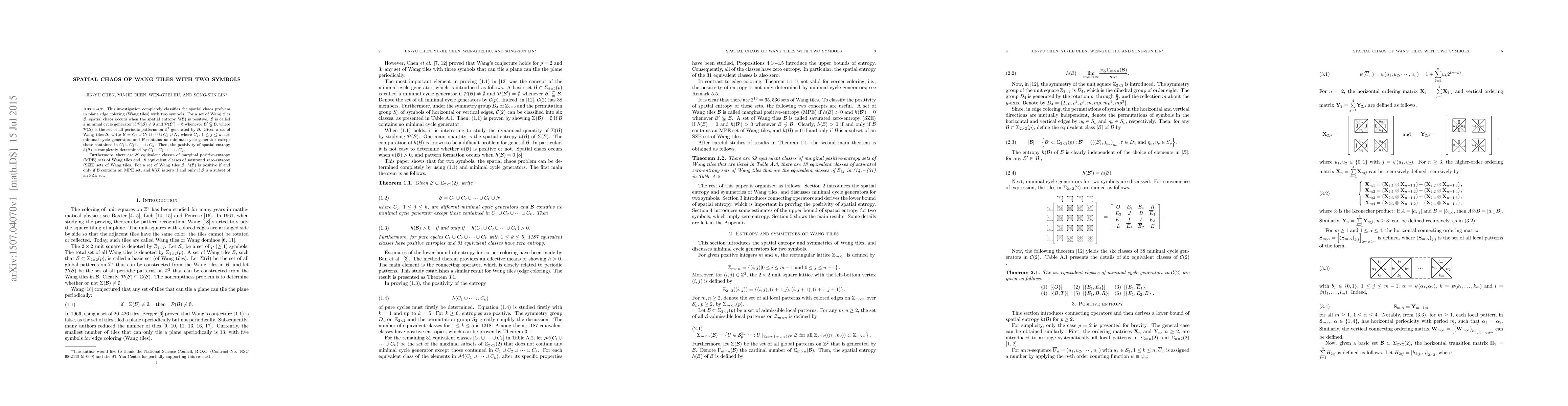 This investigation completely classifies the spatial chaos problem in plane edge coloring (Wang tiles) with two symbols. For a set of Wang tiles $\mathcal{B}$, spatial chaos occurs when the spatial entropy $h(\mathcal{B})$ is positive. $\mathcal{B}$ is called a minimal cycle generator if $\mathcal{P}(\mathcal{B})\neq\emptyset$ and $\mathcal{P}(\mathcal{B}')=\emptyset$ whenever $\mathcal{B}'\subsetneqq \mathcal{B}$, where $\mathcal{P}(\mathcal{B})$ is the set of all periodic patterns on $\mathbb{Z}^{2}$ generated by $\mathcal{B}$. Given a set of Wang tiles $\mathcal{B}$, write $\mathcal{B}=C_{1}\cup C_{2} \cup\cdots \cup C_{k} \cup N$, where $C_{j}$, $1\leq j\leq k$, are minimal cycle generators and $\mathcal{B}$ contains no minimal cycle generator except those contained in $C_{1}\cup C_{2} \cup\cdots \cup C_{k}$. Then, the positivity of spatial entropy $h(\mathcal{B})$ is completely determined by $C_{1}\cup C_{2} \cup\cdots \cup C_{k}$. Furthermore, there are 39 equivalent classes of marginal positive-entropy (MPE) sets of Wang tiles and 18 equivalent classes of saturated zero-entropy (SZE) sets of Wang tiles. For a set of Wang tiles $\mathcal{B}$, $h(\mathcal{B})$ is positive if and only if $\mathcal{B}$ contains an MPE set, and $h(\mathcal{B})$ is zero if and only if $\mathcal{B}$ is a subset of an SZE set.