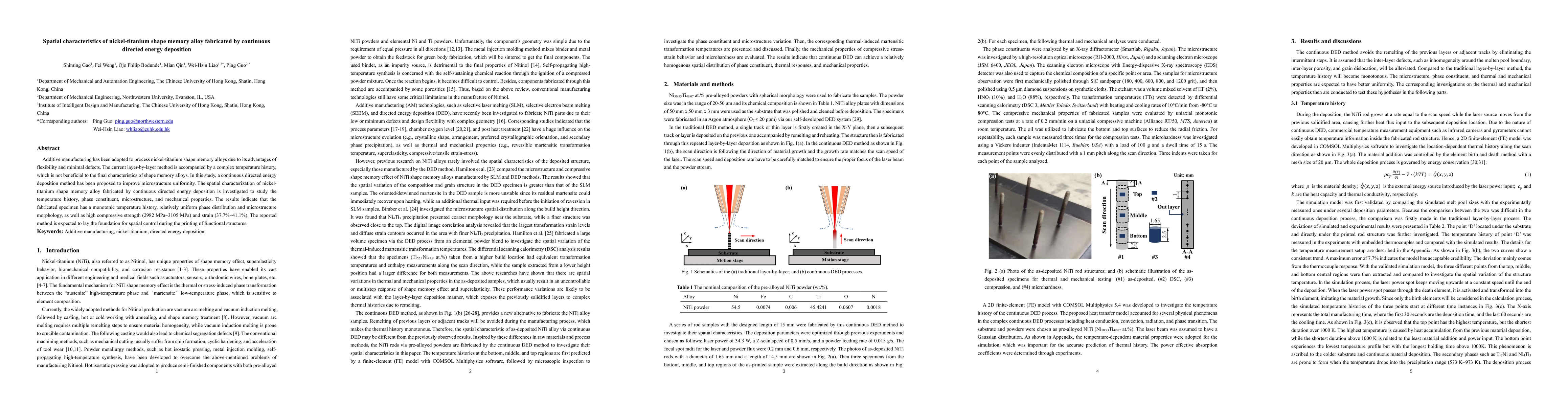 This study proposes a continuous directed energy deposition method to fabricate nickel-titanium shape memory alloys, achieving uniform microstructure and improved mechanical properties. The method results in a monotonic temperature history, uniform phase distribution, and high compressive strength and strain, suggesting potential for functional structure printing.