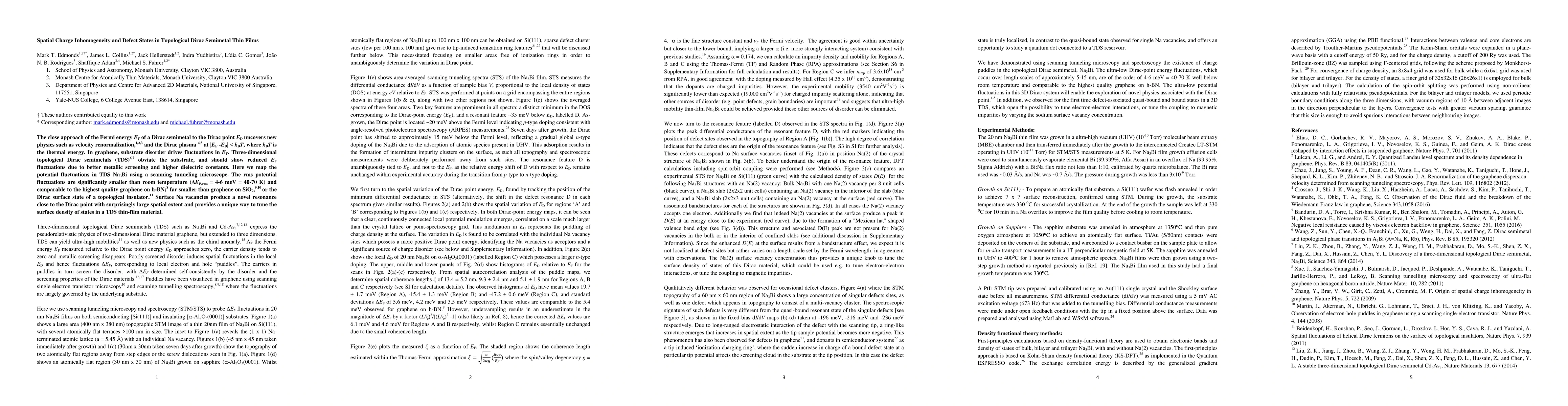 The close approach of the Fermi energy EF of a Dirac semimetal to the Dirac point ED uncovers new physics such as velocity renormalization,1,2,3 and the Dirac plasma 4,5 at |EF -ED| < kBT, where kBT is the thermal energy. In graphene, substrate disorder drives fluctuations in EF. Three-dimensional topological Dirac semimetals (TDS)6,7 obviate the substrate, and should show reduced EF fluctuations due to better metallic screening and higher dielectric constants. Here we map the potential fluctuations in TDS Na3Bi using a scanning tunneling microscope. The rms potential fluctuations are significantly smaller than room temperature ({\Delta}EF,rms = 4-6 meV = 40-70 K) and comparable to the highest quality graphene on h-BN;8 far smaller than graphene on SiO2,9,10 or the Dirac surface state of a topological insulator.11 Surface Na vacancies produce a novel resonance close to the Dirac point with surprisingly large spatial extent and provides a unique way to tune the surface density of states in a TDS thin-film material.
