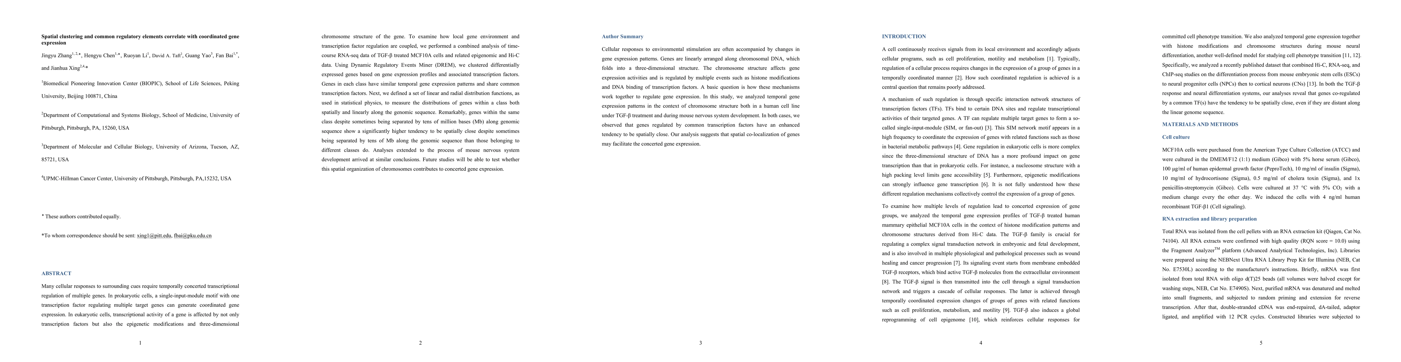This paper investigates how spatial clustering and common regulatory elements correlate with coordinated gene expression in eukaryotic cells. Through analysis of RNA-seq data, epigenomic data, and Hi-C data, the study finds that genes with similar expression patterns and shared transcription factors tend to cluster spatially within the genome, suggesting a potential role for chromosomal organization in gene regulation.