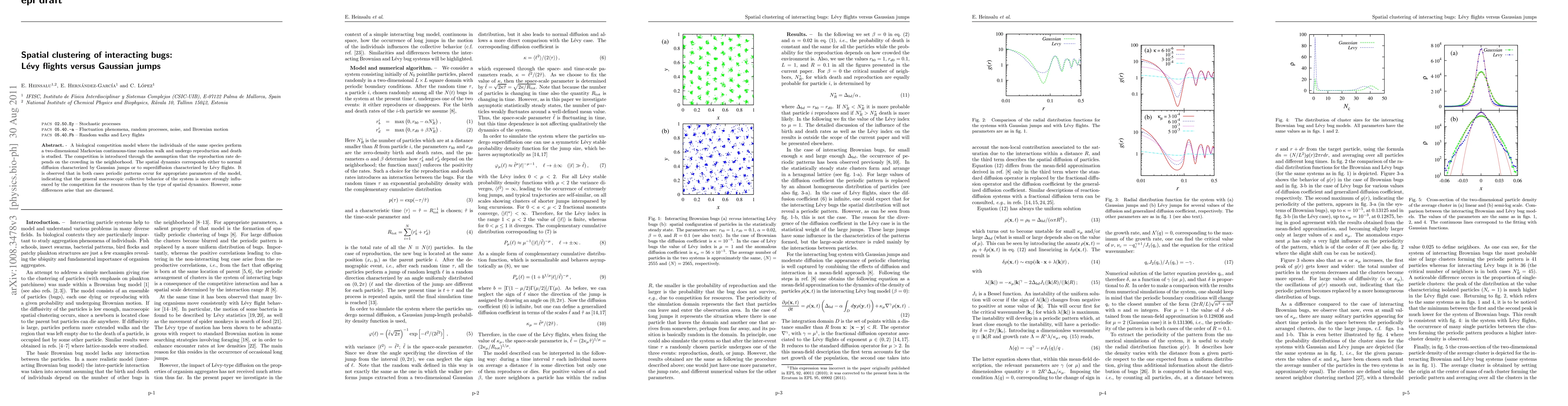 A biological competition model where the individuals of the same species perform a two-dimensional Markovian continuous-time random walk and undergo reproduction and death is studied. The competition is introduced through the assumption that the reproduction rate depends on the crowding in the neighborhood. The spatial dynamics corresponds either to normal diffusion characterized by Gaussian jumps or to superdiffusion characterized by L\'evy flights. It is observed that in both cases periodic patterns occur for appropriate parameters of the model, indicating that the general macroscopic collective behavior of the system is more strongly influenced by the competition for the resources than by the type of spatial dynamics. However, some differences arise that are discussed.