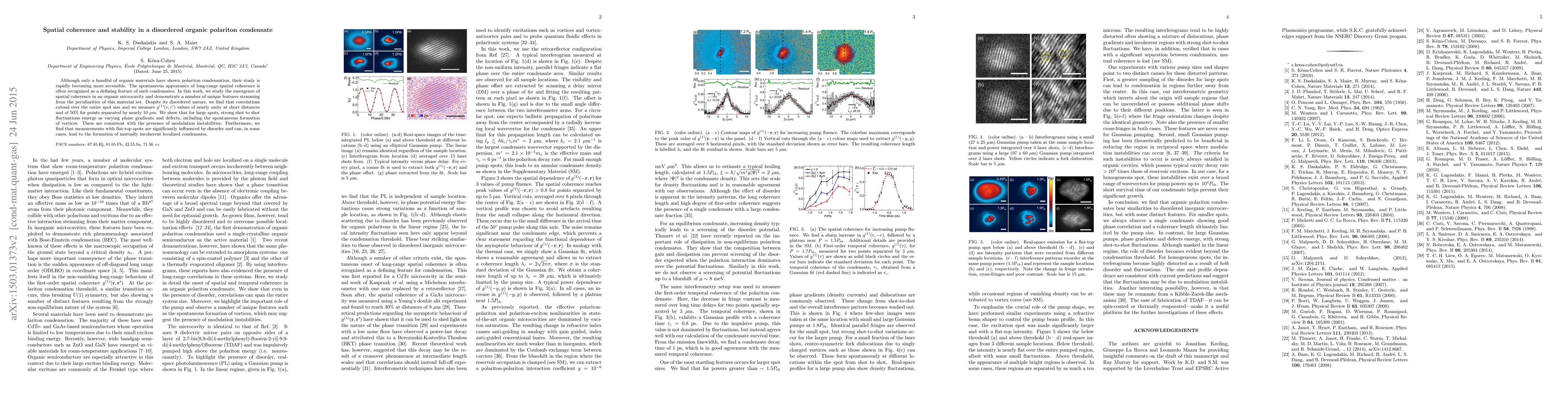 This paper investigates the spatial coherence and stability of polariton condensates in disordered organic materials within a microcavity. Despite the material's disorder, long-range coherence is observed, with $g^{(1)}(r,r')$ values indicating strong correlations. However, large spots exhibit shot-to-shot fluctuations and vortex formation due to modulation instabilities.