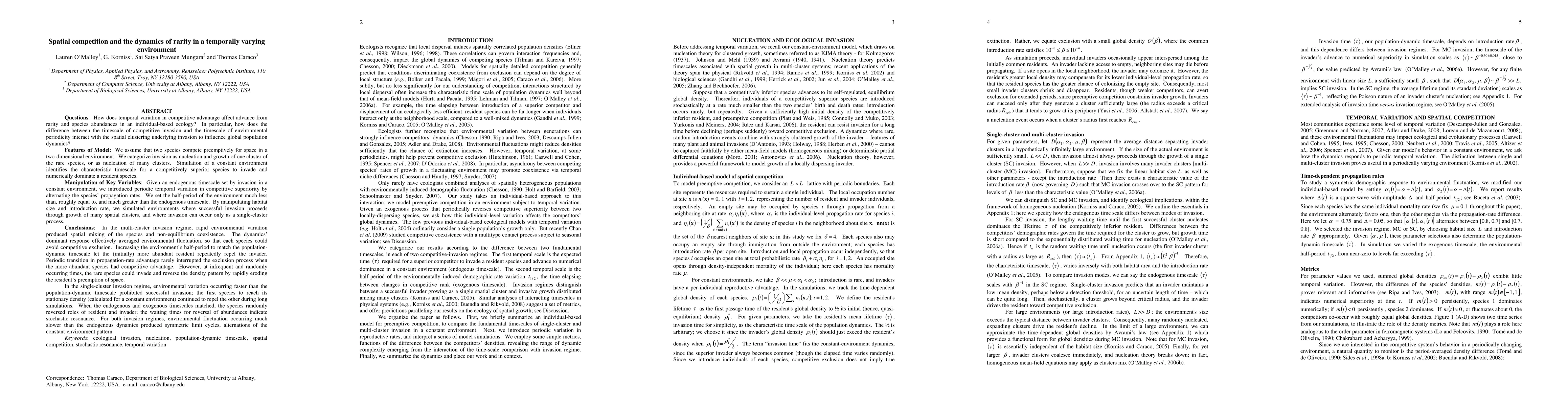 Given an endogenous timescale set by invasion in a constant environment, we introduced periodic temporal variation in competitive superiority by alternating the species' propagation rates. By manipulating habitat size and introduction rate, we simulated environments where successful invasion proceeds through growth of many spatial clusters, and where invasion can occur only as a single-cluster process. In the multi-cluster invasion regime, rapid environmental variation produced spatial mixing of the species and non-equilibrium coexistence. The dynamics' dominant response effectively averaged environmental fluctuation, so that each species could avoid competitive exclusion. Increasing the environment's half-period to match the population-dynamic timescale let the (initially) more abundant resident repeatedly repel the invader. Periodic transition in propagation-rate advantage rarely interrupted the exclusion process when the more abundant species had competitive advantage. However, at infrequent and randomly occurring times, the rare species could invade and reverse the density pattern by rapidly eroding the resident's preemption of space. In the single-cluster invasion regime, environmental variation occurring faster than the population-dynamic timescale prohibited successful invasion; the first species to reach its stationary density (calculated for a constant environment) continued to repel the other during long simulations. When the endogenous and exogenous timescales matched, the species randomly reversed roles of resident and invader; the waiting times for reversal of abundances indicate stochastic resonance. For both invasion regimes, environmental fluctuation occurring much slower than the endogenous dynamics produced symmetric limit cycles, alternations of the constant-environment pattern.