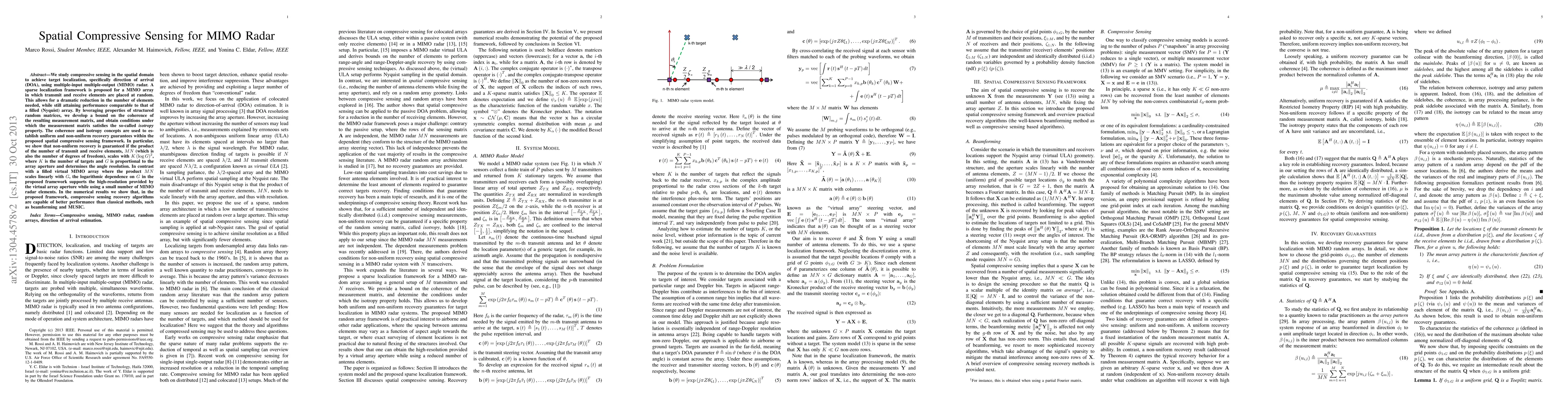 This paper proposes a spatial compressive sensing framework for MIMO radar to localize targets by estimating direction of arrival, significantly reducing the number of radar elements while maintaining performance. The framework leverages structured random matrices to achieve high-resolution target localization with fewer elements compared to traditional methods.
