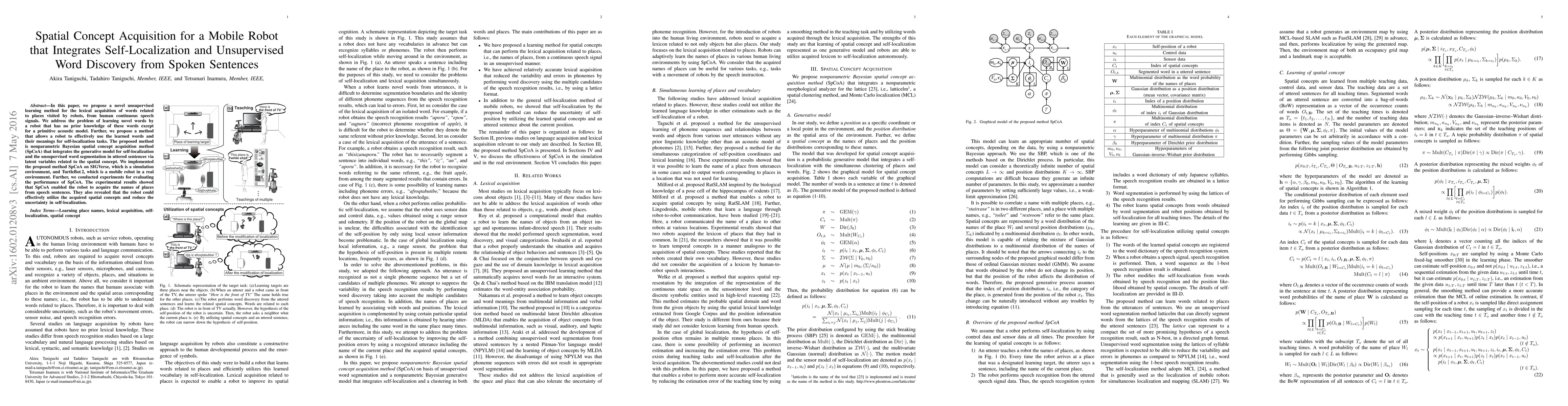 In this paper, we propose a novel unsupervised learning method for the lexical acquisition of words related to places visited by robots, from human continuous speech signals. We address the problem of learning novel words by a robot that has no prior knowledge of these words except for a primitive acoustic model. Further, we propose a method that allows a robot to effectively use the learned words and their meanings for self-localization tasks. The proposed method is nonparametric Bayesian spatial concept acquisition method (SpCoA) that integrates the generative model for self-localization and the unsupervised word segmentation in uttered sentences via latent variables related to the spatial concept. We implemented the proposed method SpCoA on SIGVerse, which is a simulation environment, and TurtleBot2, which is a mobile robot in a real environment. Further, we conducted experiments for evaluating the performance of SpCoA. The experimental results showed that SpCoA enabled the robot to acquire the names of places from speech sentences. They also revealed that the robot could effectively utilize the acquired spatial concepts and reduce the uncertainty in self-localization.