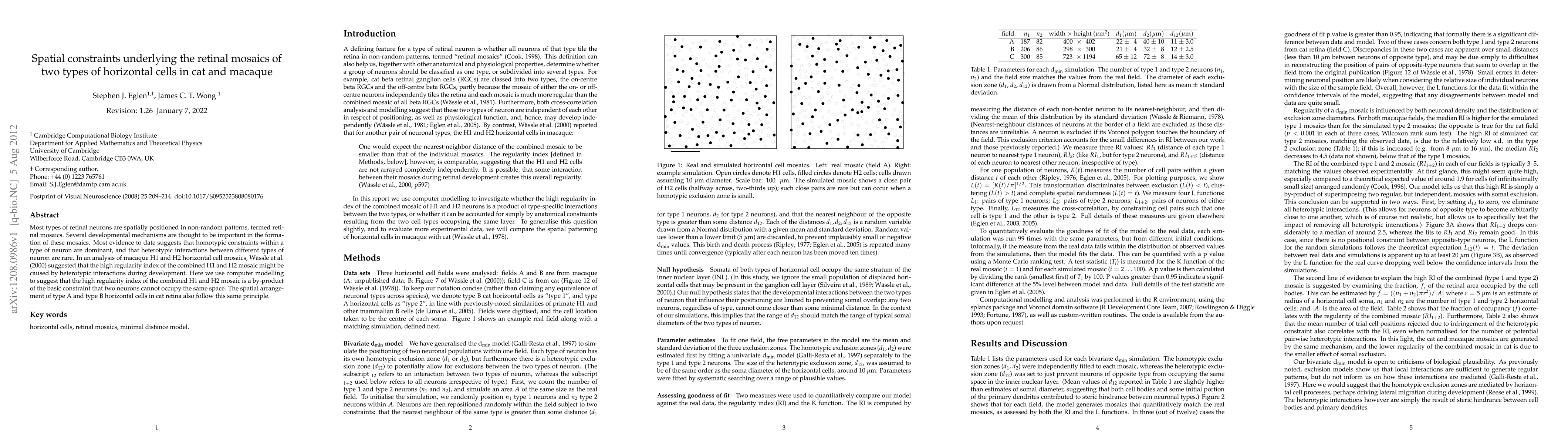 This paper explores the spatial organization of two types of horizontal cells (H1 and H2) in the retinas of cats and macaques, suggesting that their regular mosaic patterns result from homotypic constraints rather than heterotypic interactions. Computer modeling supports the idea that the spatial arrangement is primarily governed by the fundamental constraint that neurons cannot occupy the same space.