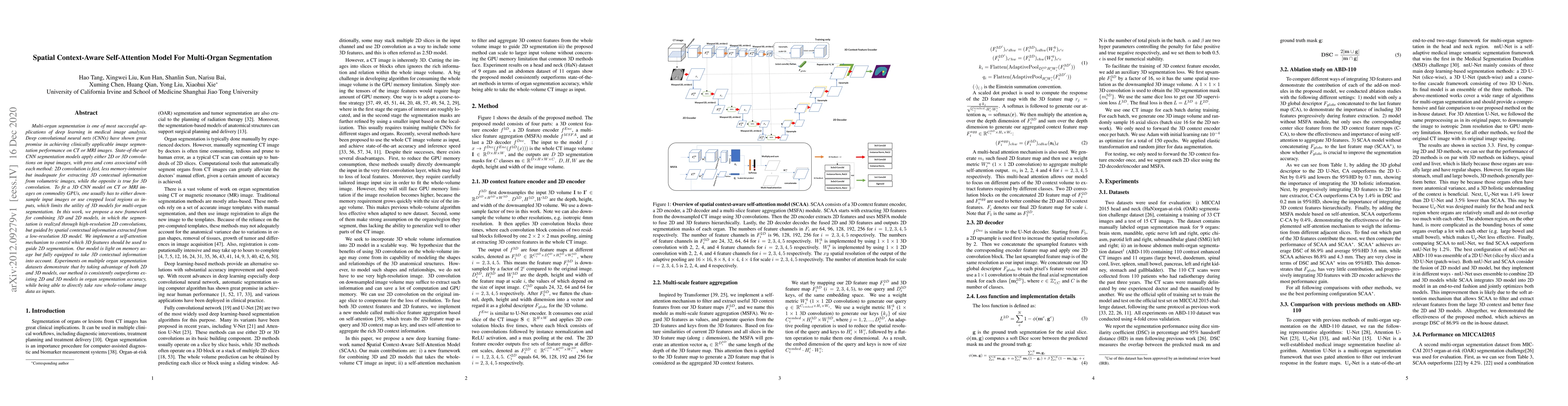 This paper proposes a hybrid spatial context-aware self-attention model combining 2D and 3D convolutional neural networks for multi-organ segmentation in medical images. The model leverages 3D contextual information from a low-resolution 3D model to guide high-resolution 2D segmentation, achieving superior accuracy over existing 2D and 3D models.