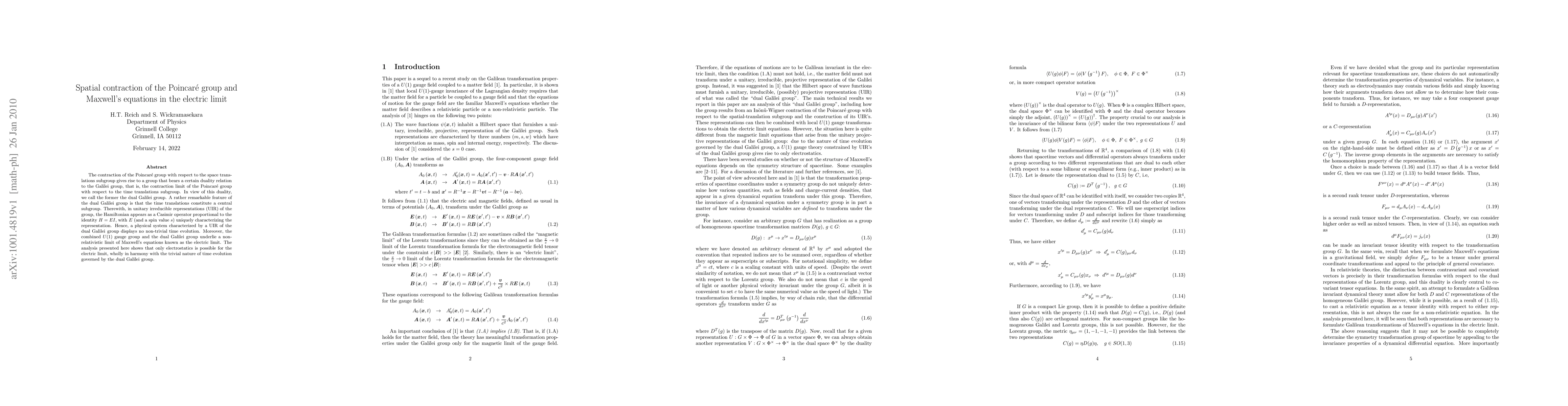 The contraction of the Poincare group with respect to the space trans- lations subgroup gives rise to a group that bears a certain duality relation to the Galilei group, that is, the contraction limit of the Poincare group with respect to the time translations subgroup. In view of this duality, we call the former the dual Galilei group. A rather remarkable feature of the dual Galilei group is that the time translations constitute a central subgroup. Therewith, in unitary irreducible representations (UIR) of the group, the Hamiltonian appears as a Casimir operator proportional to the identity H = EI, with E (and a spin value s) uniquely characterizing the representation. Hence, a physical system characterized by a UIR of the dual Galilei group displays no non-trivial time evolution. Moreover, the combined U(1) gauge group and the dual Galilei group underlie a non- relativistic limit of Maxwell's equations known as the electric limit. The analysis presented here shows that only electrostatics is possible for the electric limit, wholly in harmony with the trivial nature of time evolution governed by the dual Galilei group.