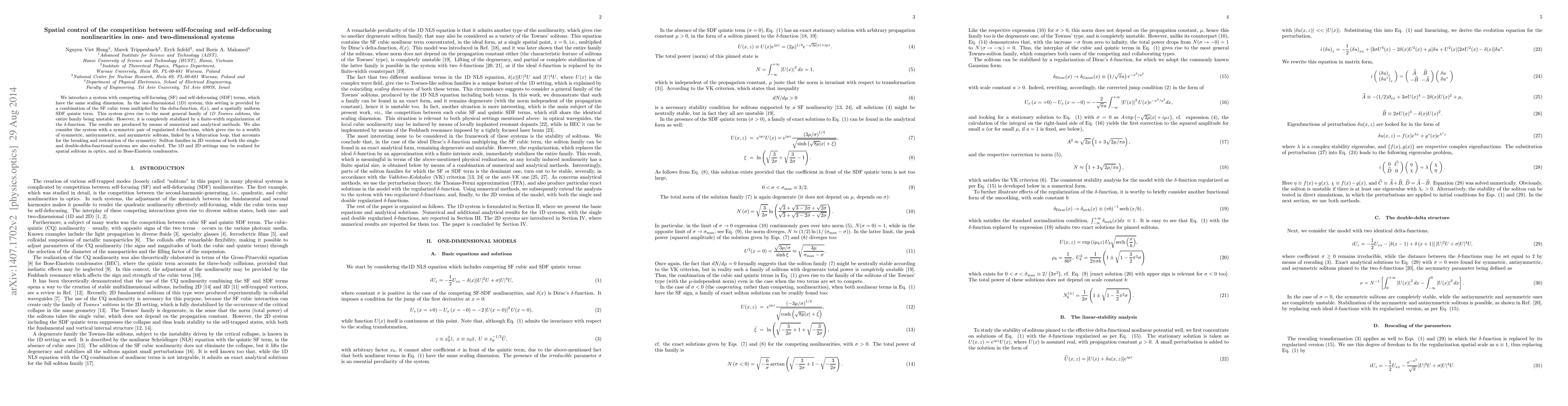 This research paper studies the balance between self-focusing and self-defocusing nonlinearities in one- and two-dimensional systems, leading to the discovery of stable solitons with unique properties.