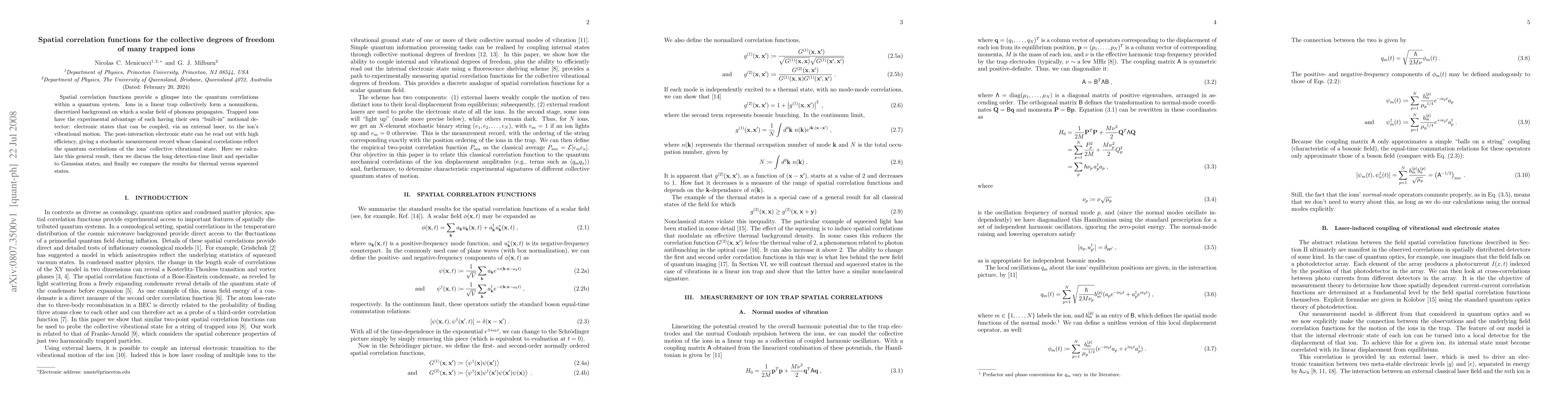 This paper calculates spatial correlation functions for collective degrees of freedom in trapped ions, providing insights into quantum correlations through a measurement record, and compares results between thermal and squeezed states.