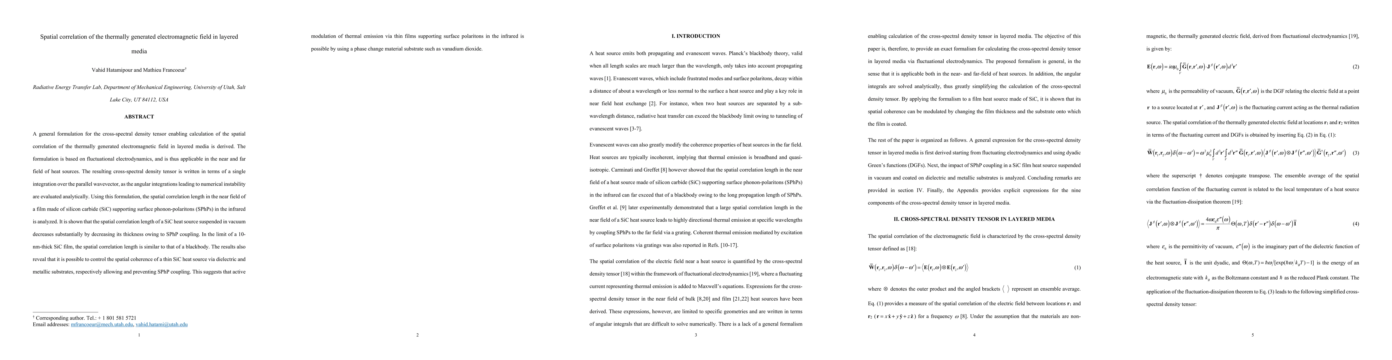 A general formulation for the cross-spectral density tensor enabling calculation of the spatial correlation of the thermally generated electromagnetic field in layered media is derived. The formulation is based on fluctuational electrodynamics, and is thus applicable in the near and far field of heat sources. The resulting cross-spectral density tensor is written in terms of a single integration over the parallel wavevector, as the angular integrations leading to numerical instability are evaluated analytically. Using this formulation, the spatial correlation length in the near field of a film made of silicon carbide (SiC) supporting surface phonon-polaritons (SPhPs) in the infrared is analyzed. It is shown that the spatial correlation length of a SiC heat source suspended in vacuum decreases substantially by decreasing its thickness owing to SPhP coupling. In the limit of a 10-nm-thick SiC film, the spatial correlation length is similar to that of a blackbody. The results also reveal that it is possible to control the spatial coherence of a thin SiC heat source via dielectric and metallic substrates, respectively allowing and preventing SPhP coupling. This suggests that active modulation of thermal emission via thin films supporting surface polaritons in the infrared is possible by using a phase change material substrate such as vanadium dioxide.