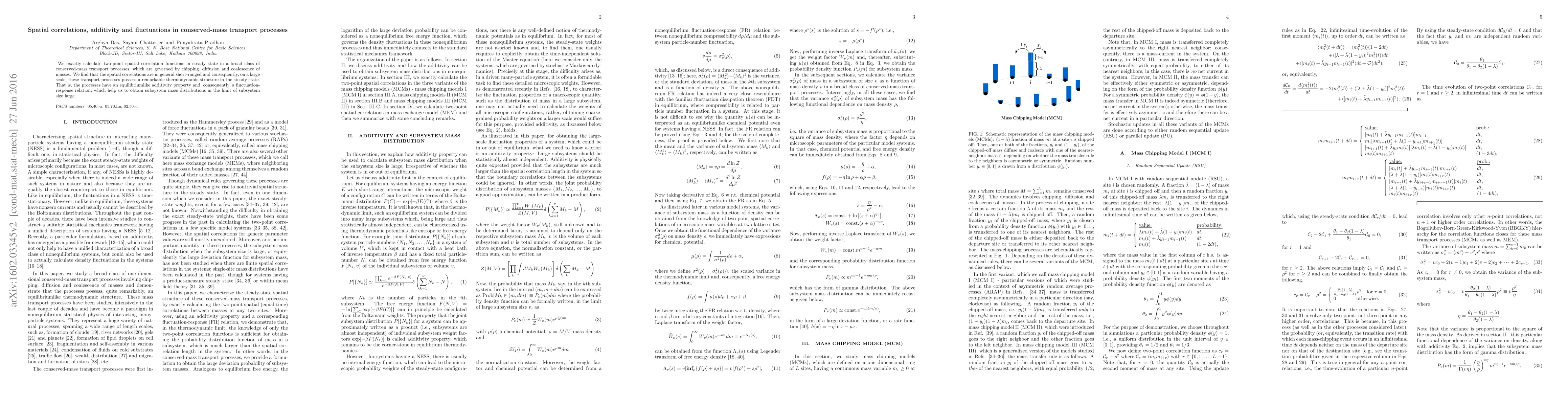 This paper calculates two-point spatial correlation functions in steady state for conserved-mass transport processes governed by chipping, diffusion, and coalescence. It reveals short-ranged spatial correlations leading to an equilibrium-like additivity property and a fluctuation-response relation, useful for determining subsystem mass distributions.