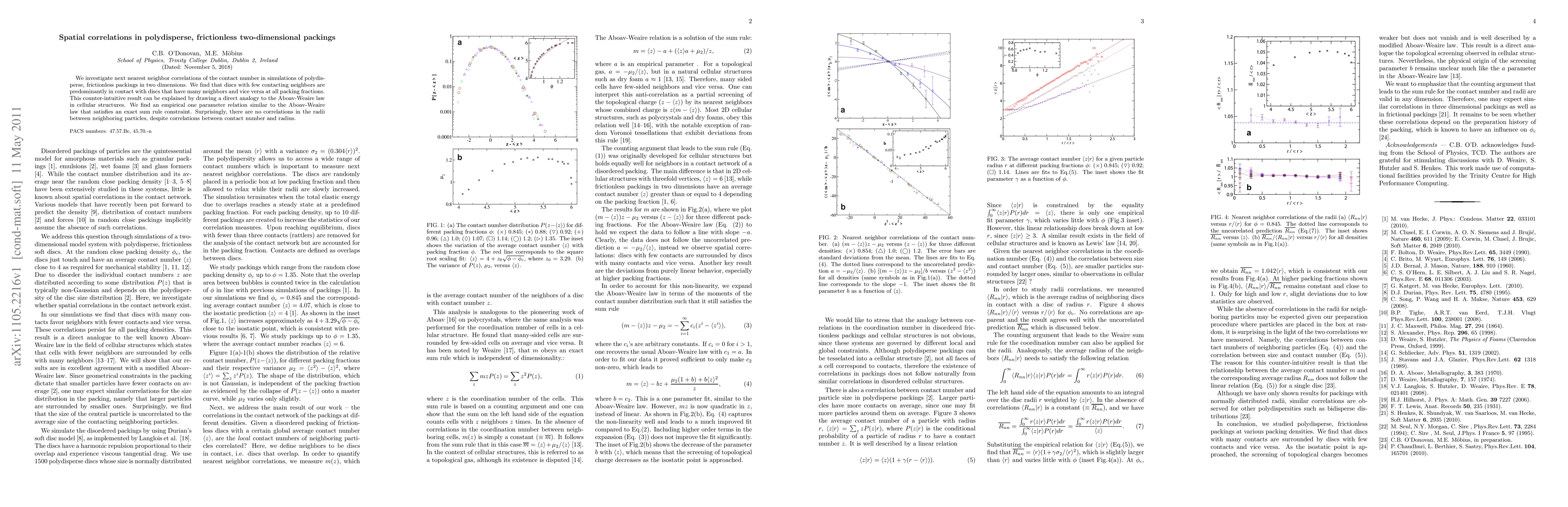 We investigate next nearest neighbor correlations of the contact number in simulations of polydisperse, frictionless packings in two dimensions. We find that discs with few contacting neighbors are predominantly in contact with discs that have many neighbors and vice versa at all packing fractions. This counter-intuitive result can be explained by drawing a direct analogy to the Aboav-Weaire law in cellular structures. We find an empirical one parameter relation similar to the Aboav-Weaire law that satisfies an exact sum rule constraint. Surprisingly, there are no correlations in the radii between neighboring particles, despite correlations between contact number and radius.