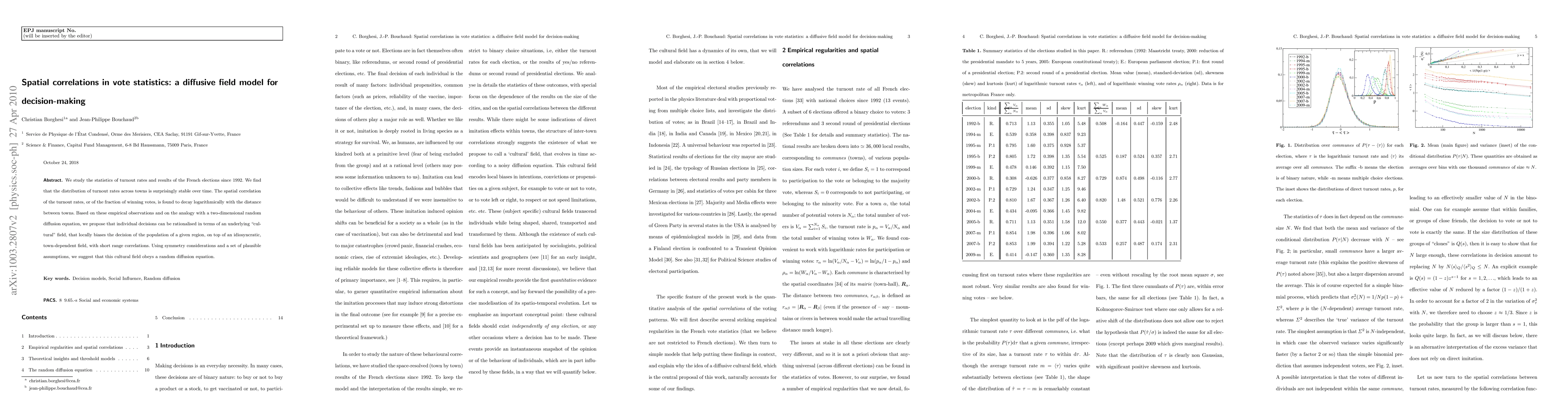 We study the statistics of turnout rates and results of the French elections since 1992. We find that the distribution of turnout rates across towns is surprisingly stable over time. The spatial correlation of the turnout rates, or of the fraction of winning votes, is found to decay logarithmically with the distance between towns. Based on these empirical observations and on the analogy with a two-dimensional random diffusion equation, we propose that individual decisions can be rationalised in terms of an underlying "cultural" field, that locally biases the decision of the population of a given region, on top of an idiosyncratic, town-dependent field, with short range correlations. Using symmetry considerations and a set of plausible assumptions, we suggest that this cultural field obeys a random diffusion equation.