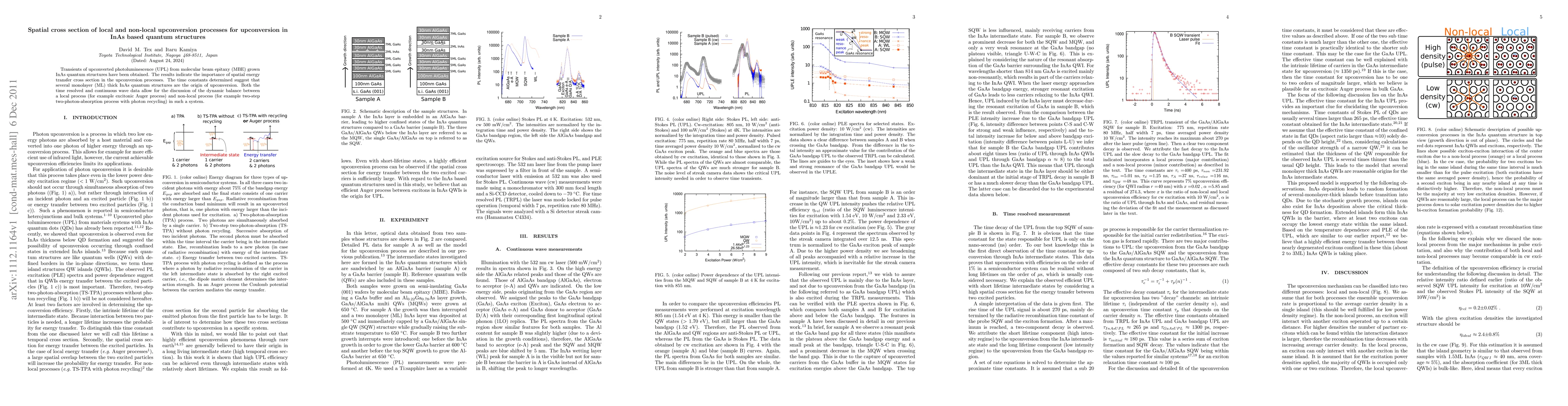 Transients of upconverted photoluminescence (UPL) from molecular beam epitaxy (MBE) grown InAs quantum structures have been obtained. The results indicate the importance of spatial energy transfer cross section in the upconversion processes. The time constants determined suggest that several monolayer (ML) thick InAs quantum structures are the origin of upconversion. Both the time resolved and continuous wave data allow for the discussion of the dynamic balance between a local process (for example excitonic Auger process) and non-local process (for example two-step two-photon-absorption process with photon recycling) in such a system.