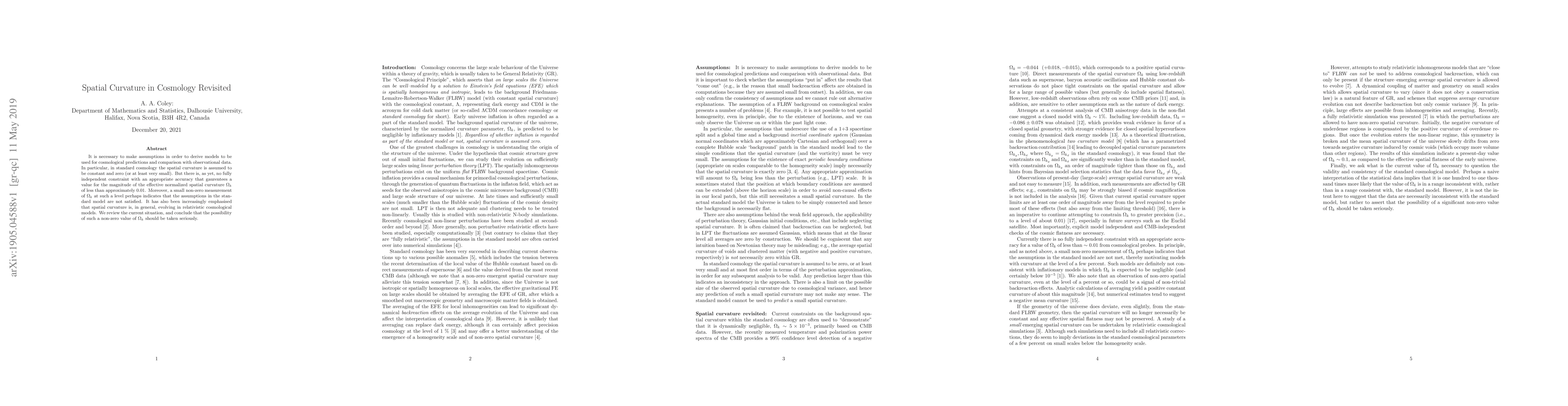 It is necessary to make assumptions in order to derive models to be used for cosmological predictions and comparison with observational data. In particular, in standard cosmology the spatial curvature is assumed to be constant and zero (or at least very small). But there is, as yet, no fully independent constraint with an appropriate accuracy that gaurentees a value for the magnitude of the effective normalized spatial curvature $\Omega_{k}$ of less than approximately $0.01$. Moreover, a small non-zero measurement of $\Omega_{k}$ at such a level perhaps indicates that the assumptions in the standard model are not satisfied. It has also been increasingly emphasised that spatial curvature is, in general, evolving in relativistic cosmological models. We review the current situation, and conclude that the possibility of such a non-zero value of $\Omega_k$ should be taken seriously.
