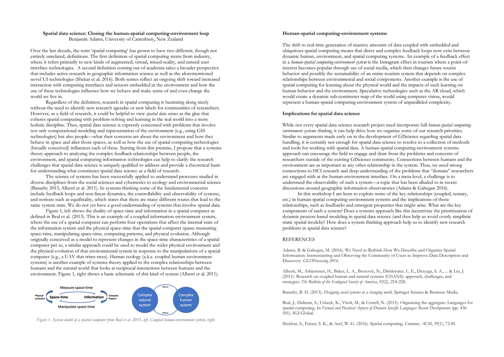 Over the last decade, the term spatial computing has grown to have two different, though not entirely unrelated, definitions. The first definition of spatial computing stems from industry, where it refers primarily to new kinds of augmented, virtual, mixed-reality, and natural user interface technologies. A second definition coming out of academia takes a broader perspective that includes active research in geographic information science as well as the aforementioned novel UI technologies. Both senses reflect an ongoing shift toward increased interaction with computing interfaces and sensors embedded in the environment and how the use of these technologies influence how we behave and make sense of and even change the world we live in. Regardless of the definition, research in spatial computing is humming along nicely without the need to identify new research agendas or new labels for communities of researchers. However, as a field of research, it could be helpful to view spatial data science as the glue that coheres spatial computing with problem-solving and learning in the real world into a more holistic discipline.