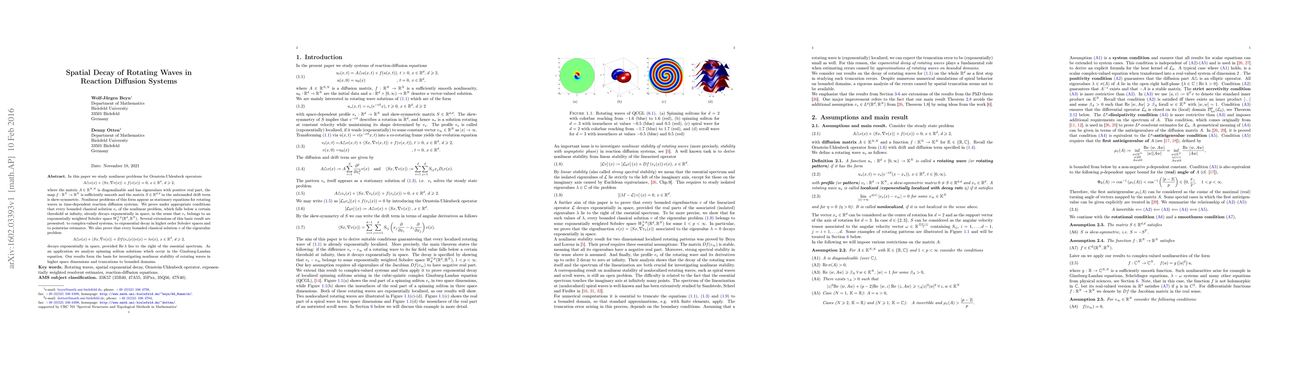 In this paper we study nonlinear problems for Ornstein-Uhlenbeck operators \begin{align*} A\triangle v(x) + \left\langle Sx,\nabla v(x)\right\rangle + f(v(x)) = 0,\,x\in\mathbb{R}^d,\,d\geqslant 2, \end{align*} where the matrix $A\in\mathbb{R}^{N,N}$ is diagonalizable and has eigenvalues with positive real part, the map $f:\mathbb{R}^N\rightarrow\mathbb{R}^N$ is sufficiently smooth and the matrix $S\in\mathbb{R}^{d,d}$ in the unbounded drift term is skew-symmetric. Nonlinear problems of this form appear as stationary equations for rotating waves in time-dependent reaction diffusion systems. We prove under appropriate conditions that every bounded classical solution $v_{\star}$ of the nonlinear problem, which falls below a certain threshold at infinity, already decays exponentially in space, in the sense that $v_{\star}$ belongs to an exponentially weighted Sobolev space $ W^{1,p}_{\theta}(\mathbb{R}^d,\mathbb{R}^N)$. Several extensions of this basic result are presented: to complex-valued systems, to exponential decay in higher order Sobolev spaces and to pointwise estimates. We also prove that every bounded classical solution $v$ of the eigenvalue problem \begin{align*} A\triangle v(x) + \left\langle Sx,\nabla v(x)\right\rangle + Df(v_{\star}(x))v(x) = \lambda v(x),\,x\in\mathbb{R}^d,\,d\geqslant 2, \end{align*} decays exponentially in space, provided $\mathrm{Re}\,\lambda$ lies to the right of the essential spectrum. As an application we analyze spinning soliton solutions which occur in the Ginzburg-Landau equation. Our results form the basis for investigating nonlinear stability of rotating waves in higher space dimensions and truncations to bounded domains.