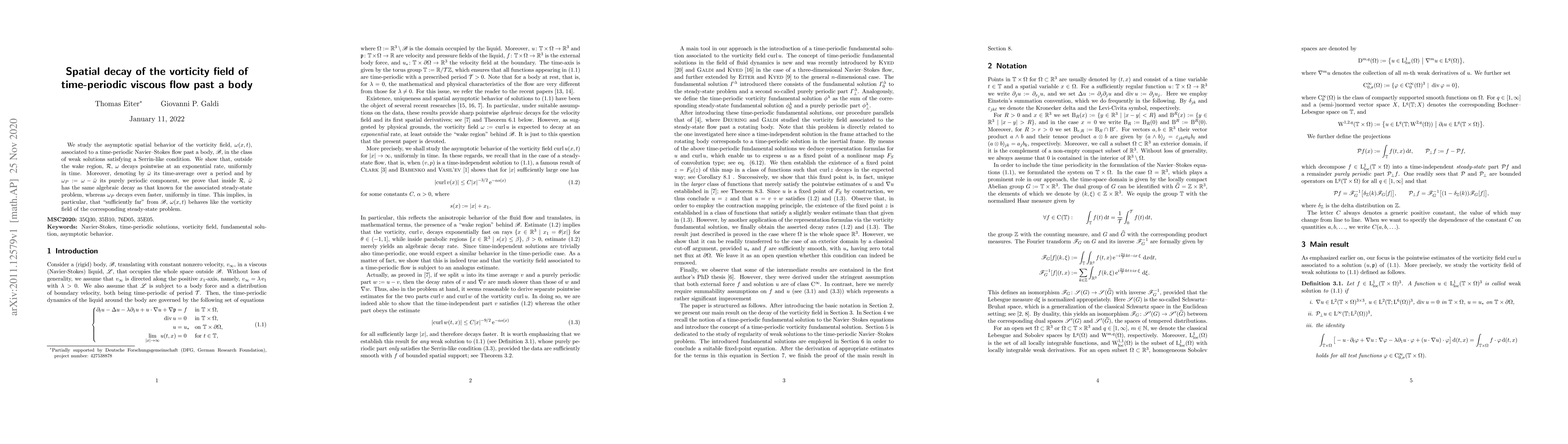 This paper investigates the spatial decay of the vorticity field in time-periodic viscous flow around a body, showing exponential decay outside the wake region and faster decay for the purely periodic component within the wake. The results suggest that far from the body, the vorticity behaves similarly to that in a steady-state problem.