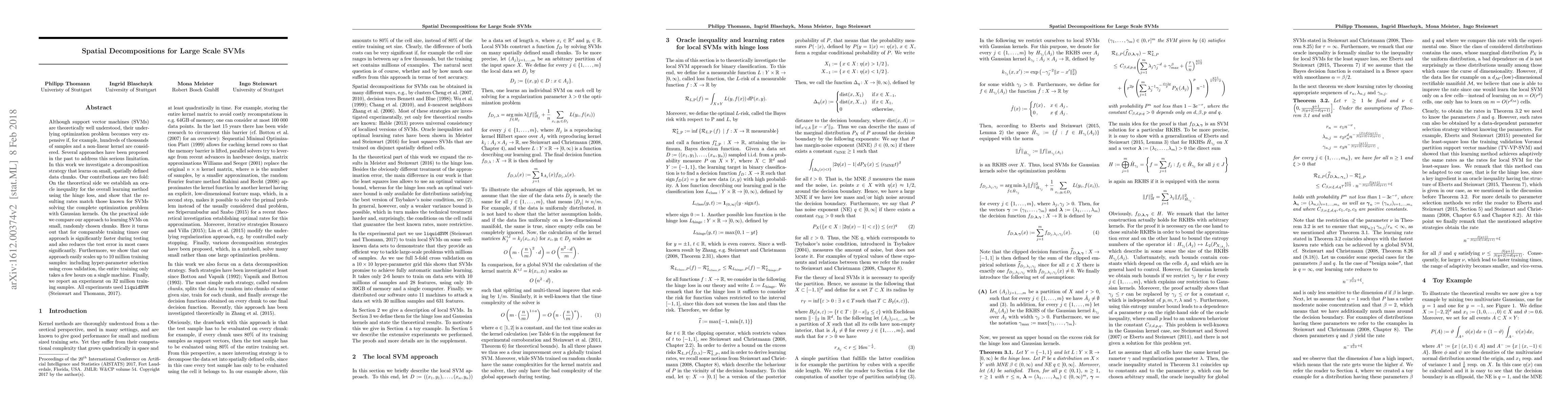 This paper proposes a spatial decomposition strategy for large-scale SVMs, demonstrating that learning on small, spatially defined data chunks is faster during testing and reduces test error. Theoretical analysis shows that the method's performance matches that of traditional SVMs, and practical experiments show scalability to 10 million samples with efficient training times.