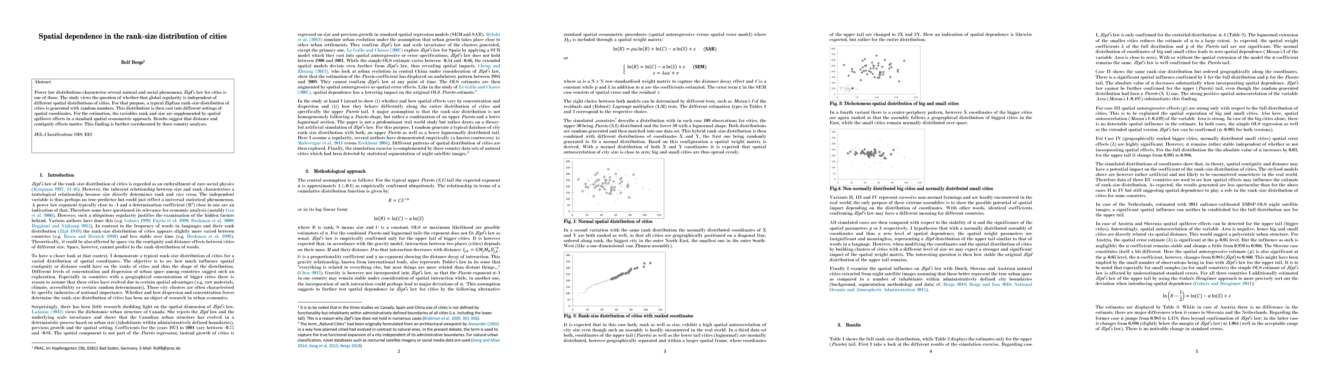 Power law distributions characterise several natural and social phenomena. The Zipf law for cities is one of those. The study views the question of whether that global regularity is independent of different spatial distributions of cities. For that purpose, a typical Zipfian rank-size distribution of cities is generated with random numbers. This distribution is then cast into different settings of spatial coordinates. For the estimation, the variables rank and size are supplemented by spatial spillover effects in a standard spatial econometric approach. Results suggest that distance and contiguity effects matter. This finding is further corroborated by three country analyses.