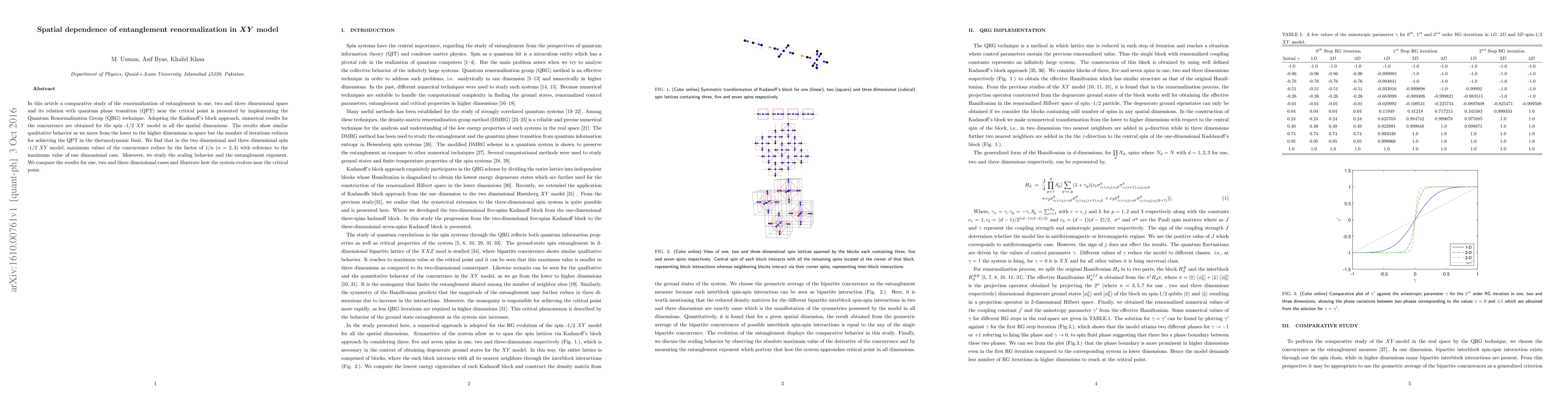 This paper investigates the spatial dependence of entanglement renormalization in the spin-1/2 XY model using the Quantum Renormalization Group technique. Results show that while entanglement behavior is qualitatively similar across dimensions, the number of iterations needed for quantum phase transition decreases, and the concurrence's maximum value scales inversely with the dimension.