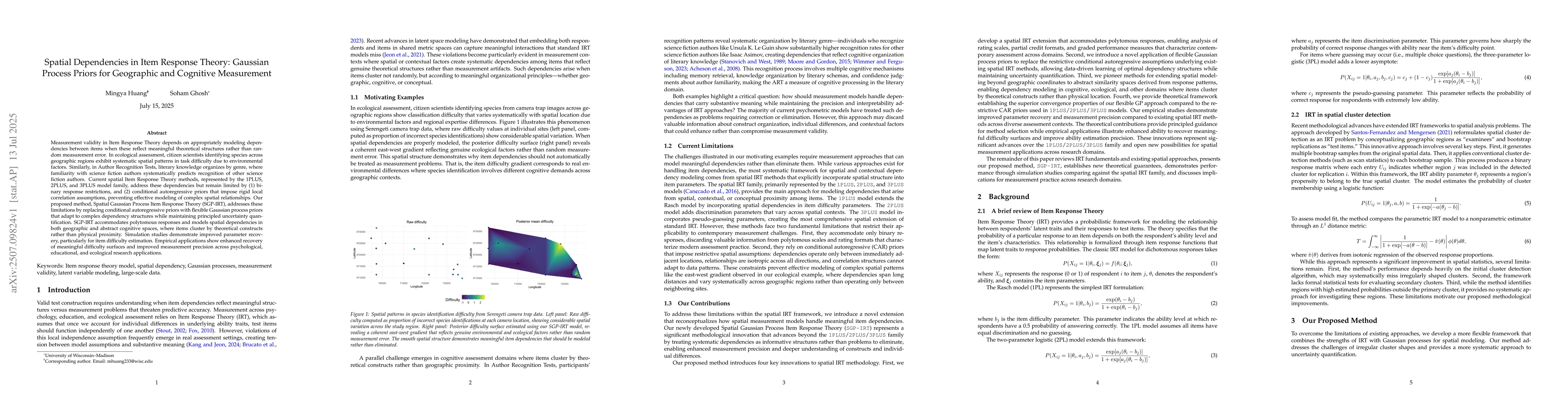 Measurement validity in Item Response Theory depends on appropriately modeling dependencies between items when these reflect meaningful theoretical structures rather than random measurement error. In ecological assessment, citizen scientists identifying species across geographic regions exhibit systematic spatial patterns in task difficulty due to environmental factors. Similarly, in Author Recognition Tests, literary knowledge organizes by genre, where familiarity with science fiction authors systematically predicts recognition of other science fiction authors. Current spatial Item Response Theory methods, represented by the 1PLUS, 2PLUS, and 3PLUS model family, address these dependencies but remain limited by (1) binary response restrictions, and (2) conditional autoregressive priors that impose rigid local correlation assumptions, preventing effective modeling of complex spatial relationships. Our proposed method, Spatial Gaussian Process Item Response Theory (SGP-IRT), addresses these limitations by replacing conditional autoregressive priors with flexible Gaussian process priors that adapt to complex dependency structures while maintaining principled uncertainty quantification. SGP-IRT accommodates polytomous responses and models spatial dependencies in both geographic and abstract cognitive spaces, where items cluster by theoretical constructs rather than physical proximity. Simulation studies demonstrate improved parameter recovery, particularly for item difficulty estimation. Empirical applications show enhanced recovery of meaningful difficulty surfaces and improved measurement precision across psychological, educational, and ecological research applications.