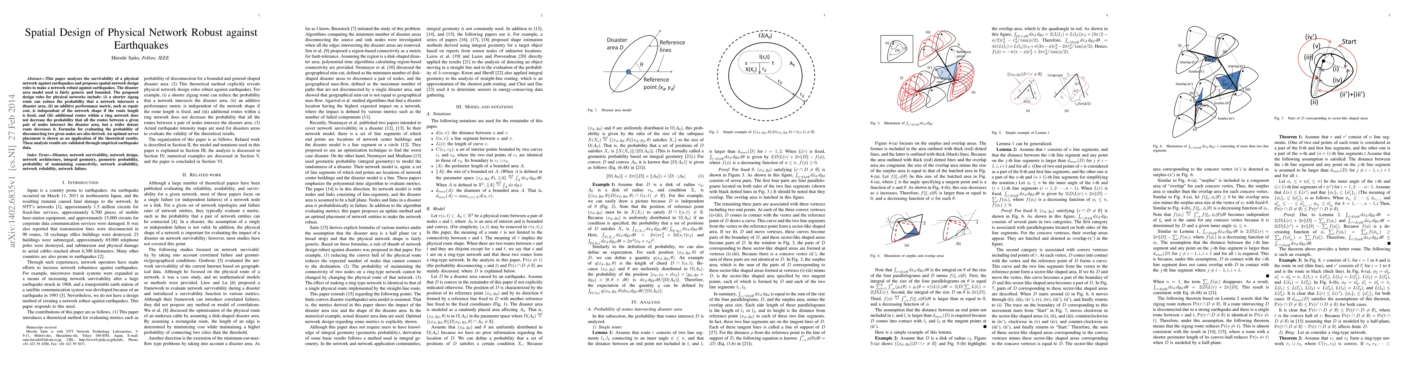 This paper proposes spatial design rules to enhance the earthquake resilience of physical networks, including shorter zigzag routes and optimal server placement, validated through empirical data. The study derives formulas to evaluate the probability of node disconnection and demonstrates that additional routes within a ring network can improve robustness.