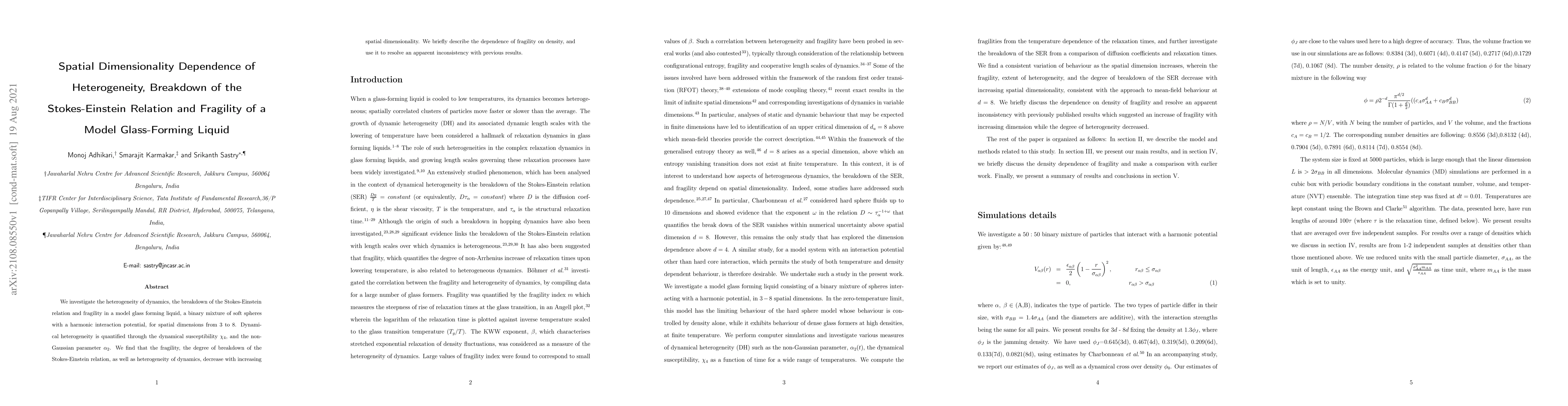 This study explores the dynamics of a model glass-forming liquid across spatial dimensions from 3 to 8, finding that heterogeneity, the breakdown of the Stokes-Einstein relation, and fragility all decrease with higher dimensionality. The research resolves previous inconsistencies by examining the density dependence of fragility.