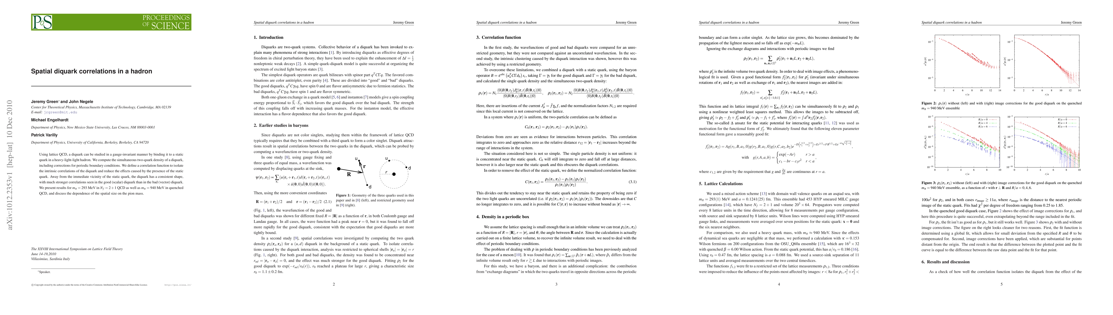 Using lattice QCD, a diquark can be studied in a gauge-invariant manner by binding it to a static quark in a heavy-light-light hadron. We compute the simultaneous two-quark density of a diquark, including corrections for periodic boundary conditions. We define a correlation function to isolate the intrinsic correlations of the diquark and reduce the effects caused by the presence of the static quark. Away from the immediate vicinity of the static quark, the diquark has a consistent shape, with much stronger correlations seen in the good (scalar) diquark than in the bad (vector) diquark. We present results for m_{\pi}=293 MeV in N_f=2+1 QCD as well as m_{\pi}=940 MeV in quenched QCD, and discuss the dependence of the spatial size on the pion mass.