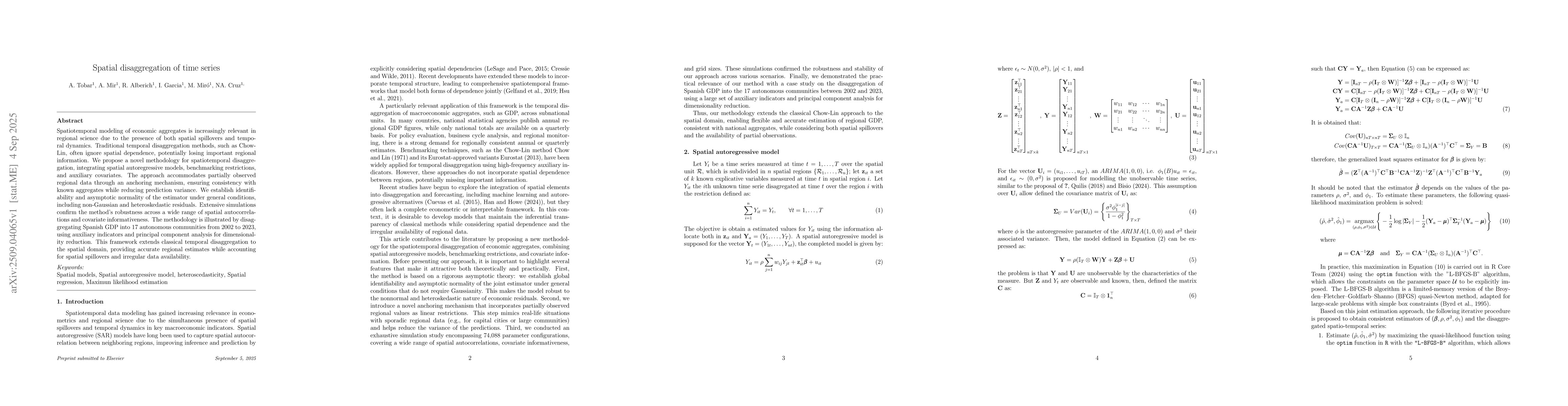 Spatiotemporal modeling of economic aggregates is increasingly relevant in regional science due to the presence of both spatial spillovers and temporal dynamics. Traditional temporal disaggregation methods, such as Chow-Lin, often ignore spatial dependence, potentially losing important regional information. We propose a novel methodology for spatiotemporal disaggregation, integrating spatial autoregressive models, benchmarking restrictions, and auxiliary covariates. The approach accommodates partially observed regional data through an anchoring mechanism, ensuring consistency with known aggregates while reducing prediction variance. We establish identifiability and asymptotic normality of the estimator under general conditions, including non-Gaussian and heteroskedastic residuals. Extensive simulations confirm the method's robustness across a wide range of spatial autocorrelations and covariate informativeness. The methodology is illustrated by disaggregating Spanish GDP into 17 autonomous communities from 2002 to 2023, using auxiliary indicators and principal component analysis for dimensionality reduction. This framework extends classical temporal disaggregation to the spatial domain, providing accurate regional estimates while accounting for spatial spillovers and irregular data availability.
