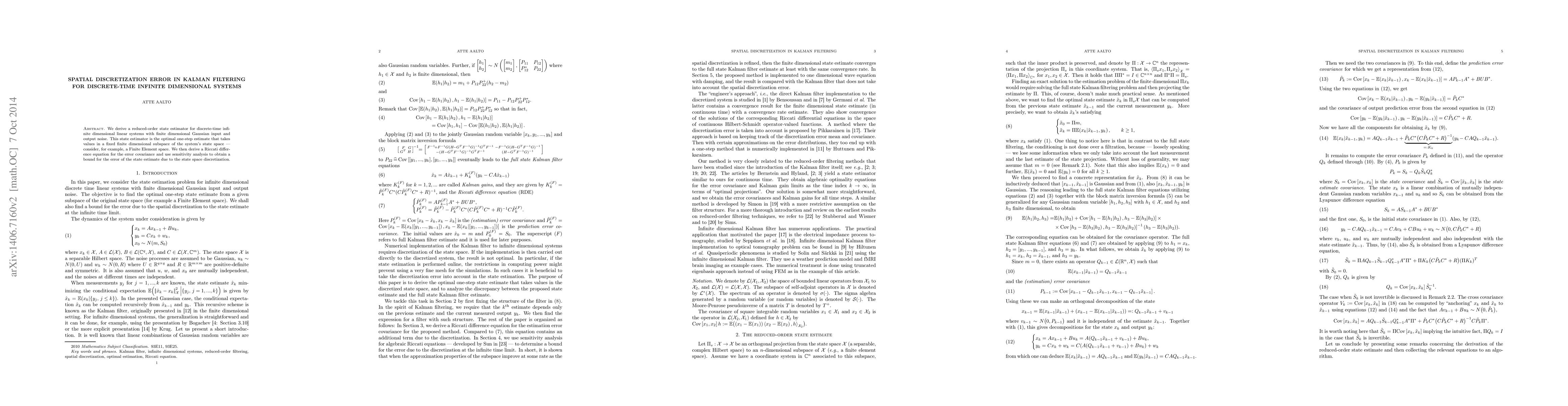 This paper develops a reduced-order state estimator for discrete-time infinite dimensional systems, deriving a Riccati difference equation for error covariance and providing a bound for discretization error in Kalman filtering. The estimator is optimal within a finite-dimensional subspace, such as a Finite Element space.