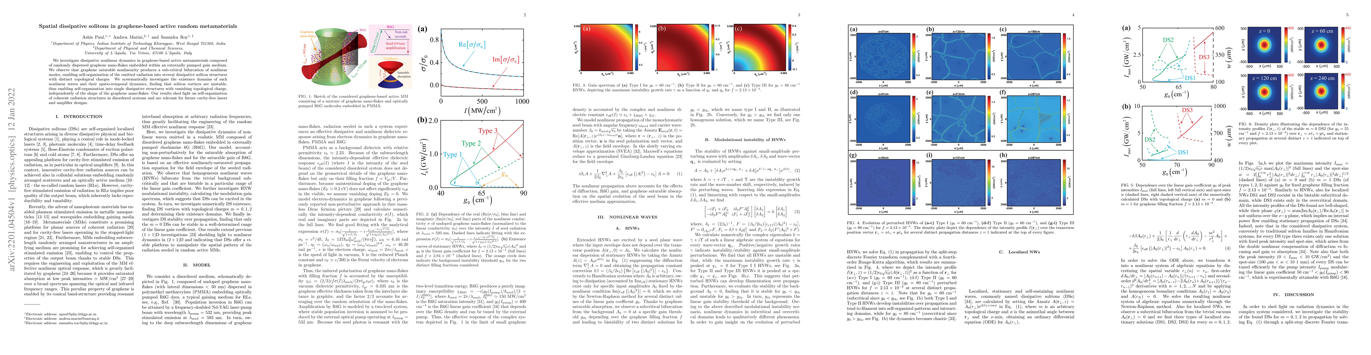 We investigate dissipative nonlinear dynamics in graphene-based active metamaterials composed of randomly dispersed graphene nano-flakes embedded within an externally pumped gain medium. We observe that graphene saturable nonlinearity produces a sub-critical bifurcation of nonlinear modes, enabling self-organization of the emitted radiation into several dissipative soliton structures with distinct topological charges. We systematically investigate the existence domains of such nonlinear waves and their spatio-temporal dynamics, finding that soliton vortices are unstable, thus enabling self-organization into single dissipative structures with vanishing topological charge, independently of the shape of the graphene nano-flakes. Our results shed light on self-organization of coherent radiation structures in disordered systems and are relevant for future cavity-free lasers and amplifier designs.