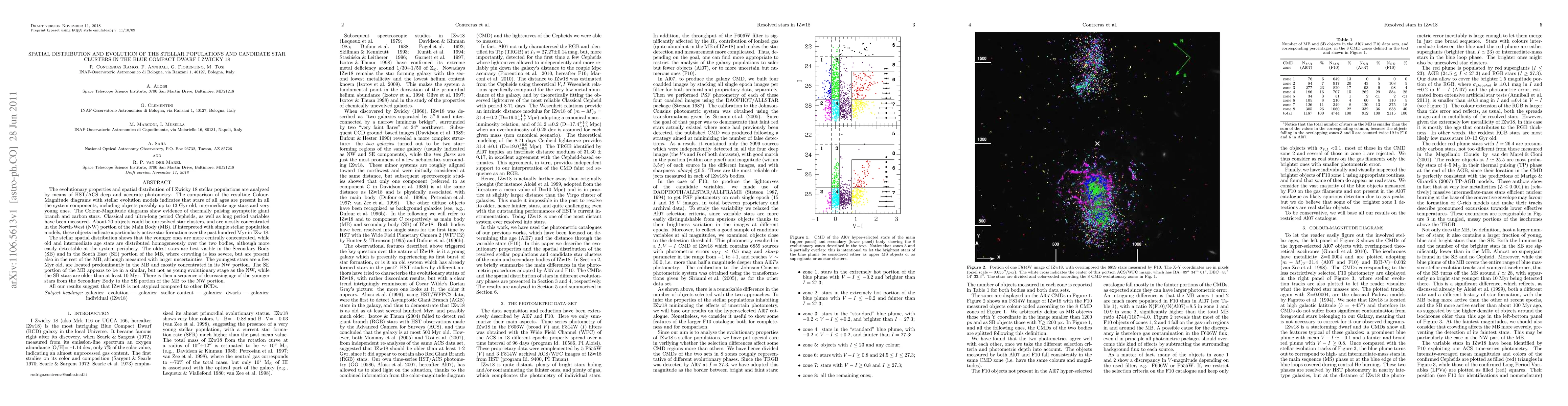 The evolutionary properties and spatial distribution of I Zwicky 18 stellar populations are analyzed by means of HST/ACS deep and accurate photometry. The comparison of the resulting Colour- Magnitude diagrams with stellar evolution models indicates that stars of all ages are present in all the system components, including ob jects possibly up to 13 Gyr old, intermediate age stars and very young ones. The Colour-Magnitude diagrams show evidence of thermally pulsing asymptotic giant branch and carbon stars. Classical and ultra-long period Cepheids, as well as long period variables have been measured. About 20 ob jects could be unresolved star clusters, and are mostly concentrated in the North-West (NW) portion of the Main Body (MB). If interpreted with simple stellar population models, these ob jects indicate a particularly active star formation over the past hundred Myr in IZw 18. The stellar spatial distribution shows that the younger ones are more centrally concentrated, while old and intermediate age stars are distributed homogeneously over the two bodies, although more easily detectable at the system periphery. The oldest stars are best visible in the Secondary Body (SB) and in the South East (SE) portion of the MB, where crowding is less severe, but are present also in the rest of the MB, although measured with larger uncertainties. The youngest stars are a few Myr old, are located predominantly in the MB and mostly concentrated in its NW portion. The SE portion of the MB appears to be in a similar, but not as young evolutionary stage as the NW, while the SB stars are older than at least 10 Myr. There is then a sequence of decreasing age of the younger stars from the Secondary Body to the SE portion of the MB to the NW portion. All our results suggest that IZw18 is not atypical compared to other BCDs.