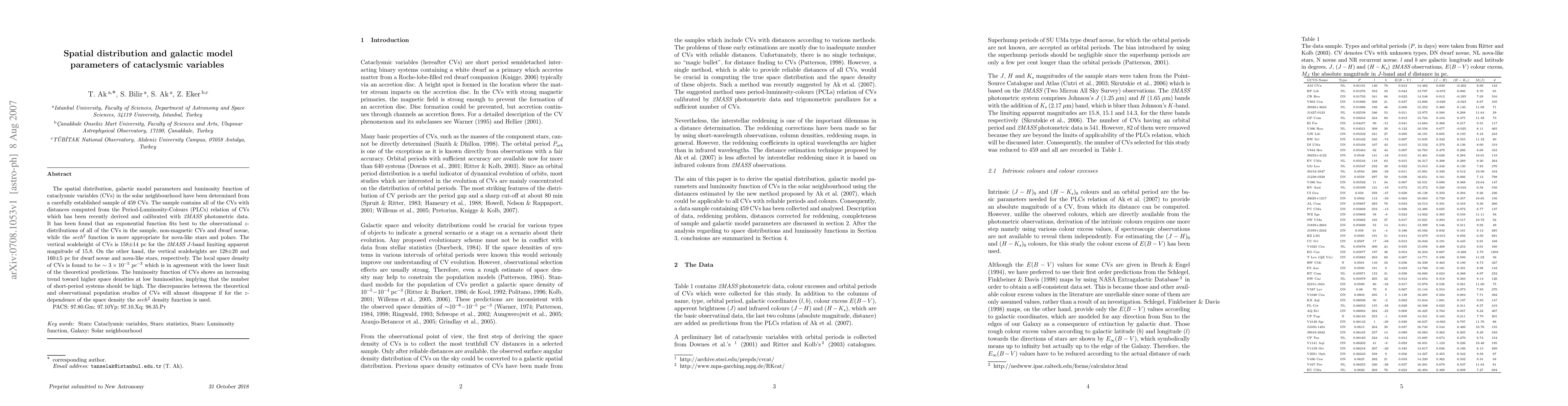 This study determines the spatial distribution and galactic model parameters of 459 cataclysmic variables (CVs) using a sample calibrated with 2MASS data. The findings suggest an exponential fit for CVs' z-distributions, with specific scaleheights for different CV types, and a local space density of $\sim3\times10^{-5}$ pc$^{-3}$. The luminosity function indicates a higher number of short-period systems at lower luminosities.