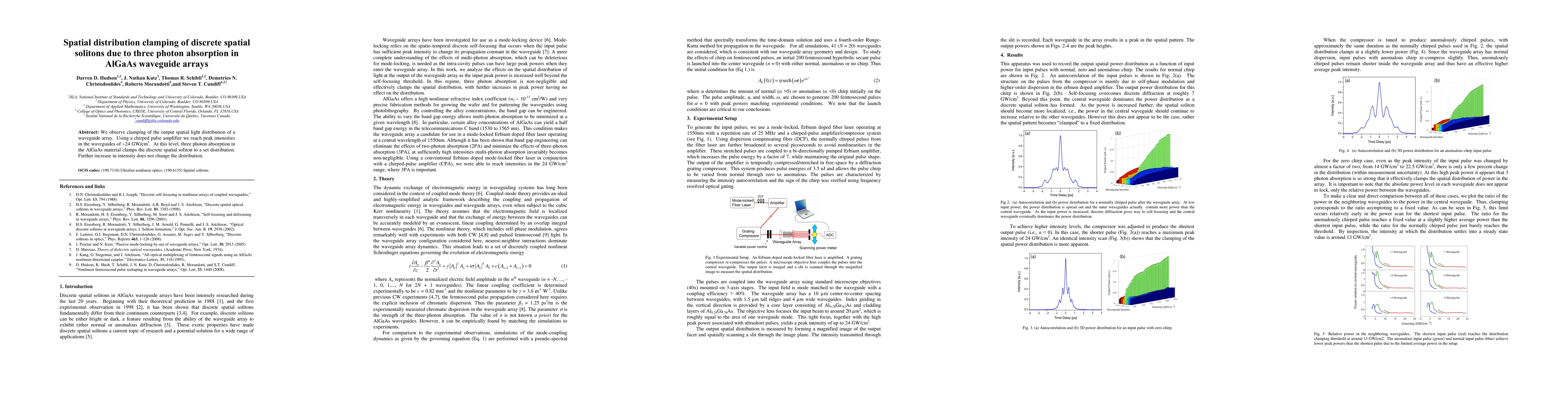 Summary: The study demonstrates clamping of discrete spatial solitons in AlGaAs waveguide arrays due to three-photon absorption, achieved at peak intensities of ~24 GW/cm² using a chirped pulse amplifier, where further intensity increases do not alter the soliton distribution.