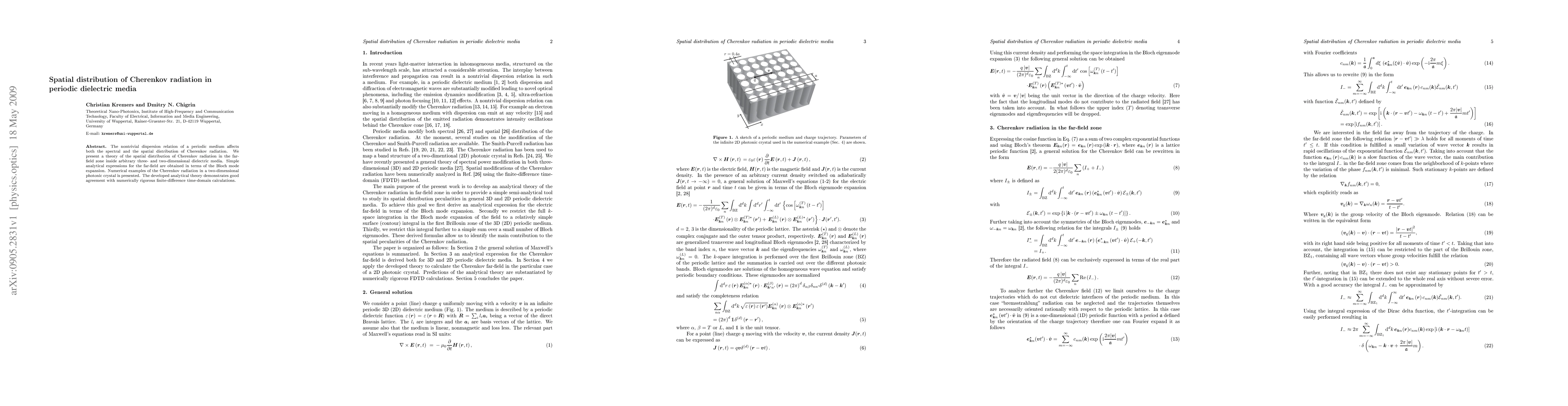 This paper develops a theoretical framework to describe the spatial distribution of Cherenkov radiation in periodic dielectric media, deriving analytical expressions for the far-field using Bloch mode expansion and validating the results with rigorous numerical simulations on a two-dimensional photonic crystal.