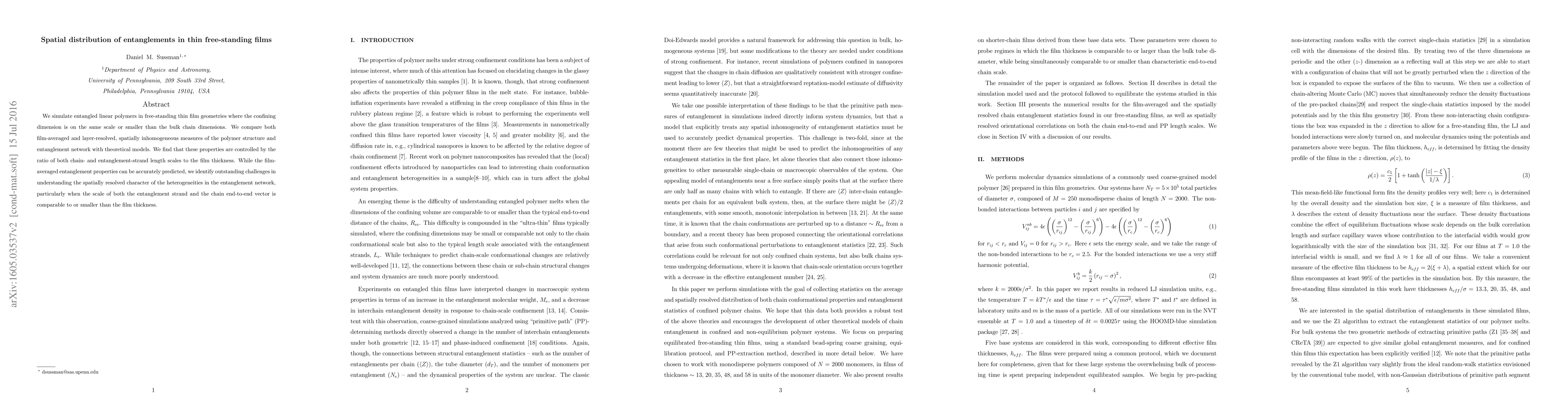 We simulate entangled linear polymers in free-standing thin film geometries where the confining dimension is on the same scale or smaller than the bulk chain dimensions. We compare both film-averaged and layer-resolved, spatially inhomogeneous measures of the polymer structure and entanglement network with theoretical models. We find that these properties are controlled by the ratio of both chain- and entanglement-strand length scales to the film thickness. While the film-averaged entanglement properties can be accurately predicted, we identify outstanding challenges in understanding the spatially resolved character of the heterogeneities in the entanglement network, particularly when the scale of both the entanglement strand and the chain end-to-end vector is comparable to or smaller than the film thickness.