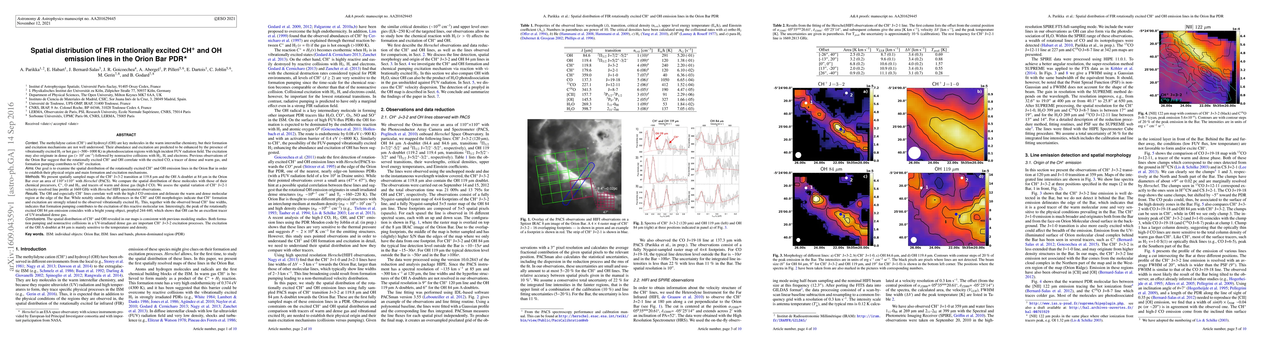 This paper investigates the spatial distribution of CH+ and OH emission lines in the Orion Bar, revealing that CH+ formation and excitation are linked to vibrationally excited H2, while OH correlates with UV-irradiated dense gas. The study uses Herschel observations to map the CH+ J=3-2 and OH Λ-doublet transitions, showing that both formation pumping and nonreactive collisions contribute to CH+ excitation, while OH is sensitive to temperature and density.