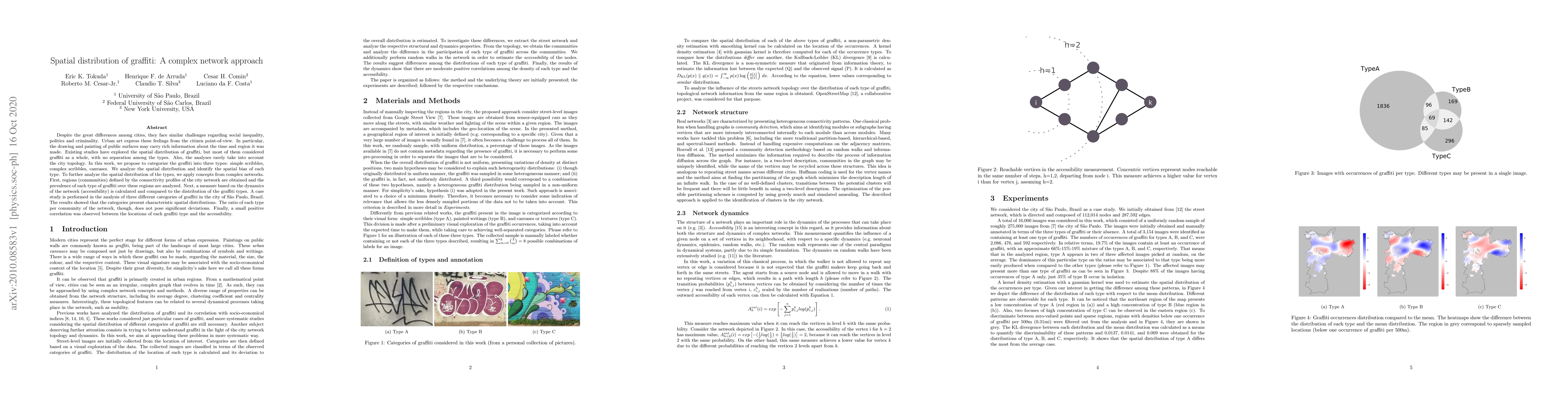 This paper categorizes graffiti into simple scribbles, complex scribbles, and canvases, analyzing their spatial distribution in Sao Paulo using complex network concepts. Findings reveal distinct spatial biases for each graffiti type, with minor deviations in prevalence across city regions, and a slight correlation between graffiti locations and network accessibility.