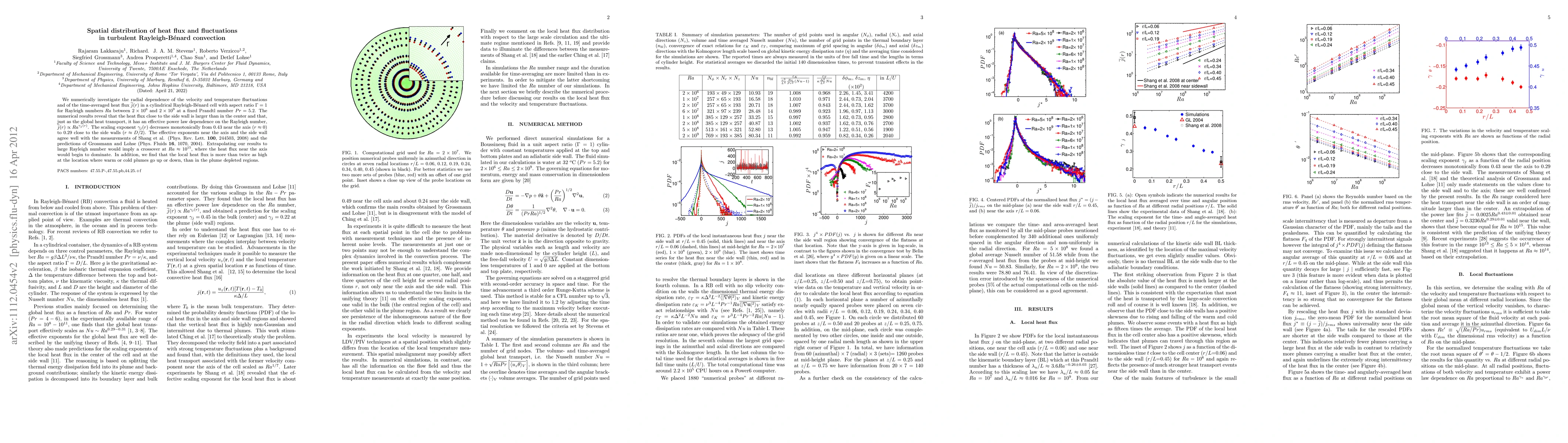 The study investigates heat flux and fluctuations in turbulent Rayleigh-Benard convection, finding that heat flux varies by location, with higher values near sidewalls than in the center. The results show a power-law dependence on the Rayleigh number, with exponents decreasing from 0.43 at the axis to 0.29 near sidewalls.