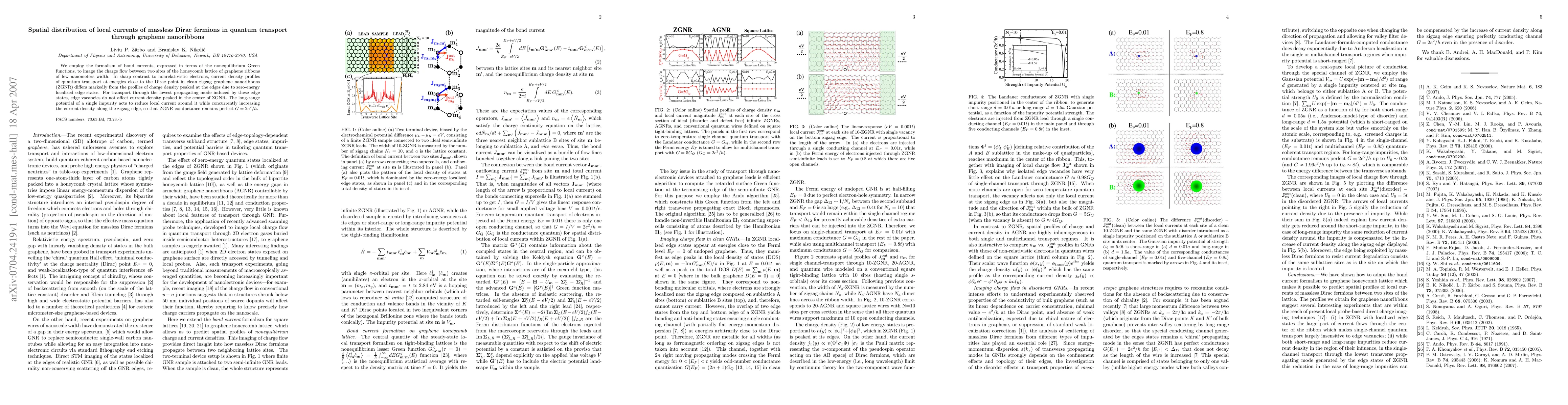 This paper investigates the spatial distribution of local currents in quantum transport through zigzag graphene nanoribbons using bond current formalism. It reveals that current density profiles differ significantly from charge density profiles due to zero-energy localized edge states, maintaining perfect conductance despite the presence of edge vacancies and impurities.