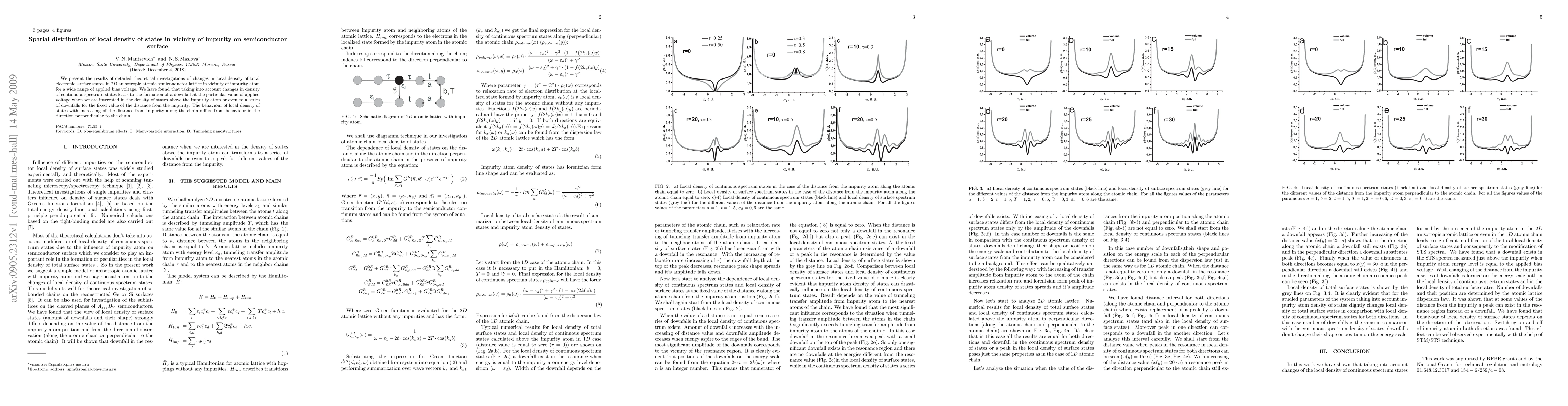 We present the results of detailed theoretical investigations of changes in local density of total electronic surface states in 2D anisotropic atomic semiconductor lattice in vicinity of impurity atom for a wide range of applied bias voltage. We have found that taking into account changes in density of continuous spectrum states leads to the formation of a downfall at the particular value of applied voltage when we are interested in the density of states above the impurity atom or even to a series of downfalls for the fixed value of the distance from the impurity. The behaviour of local density of states with increasing of the distance from impurity along the chain differs from behaviour in the direction perpendicular to the chain.