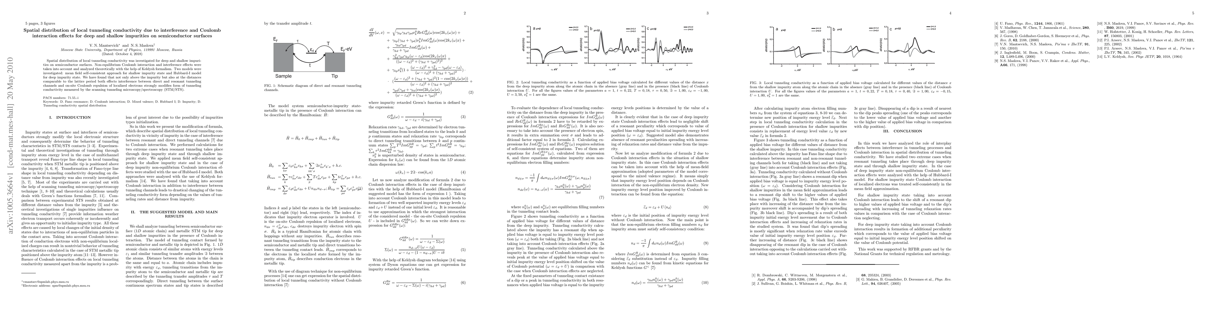 Spatial distribution of local tunneling conductivity was investigated for deep and shallow impurities on semiconductor surfaces. Non-equilibrium Coulomb interaction and interference effects were taken into account and analyzed theoretically with the help of Keldysh formalism. Two models were investigated: mean field self-consistent approach for shallow impurity state and Hubbard-{I} model for deep impurity state. We have found that not only above the impurity but also at the distances comparable to the lattice period both effects interference between direct and resonant tunneling channels and on-site Coulomb repulsion of localized electrons strongly modifies form of tunneling conductivity measured by the scanning tunneling microscopy/spectroscopy (STM/STS).