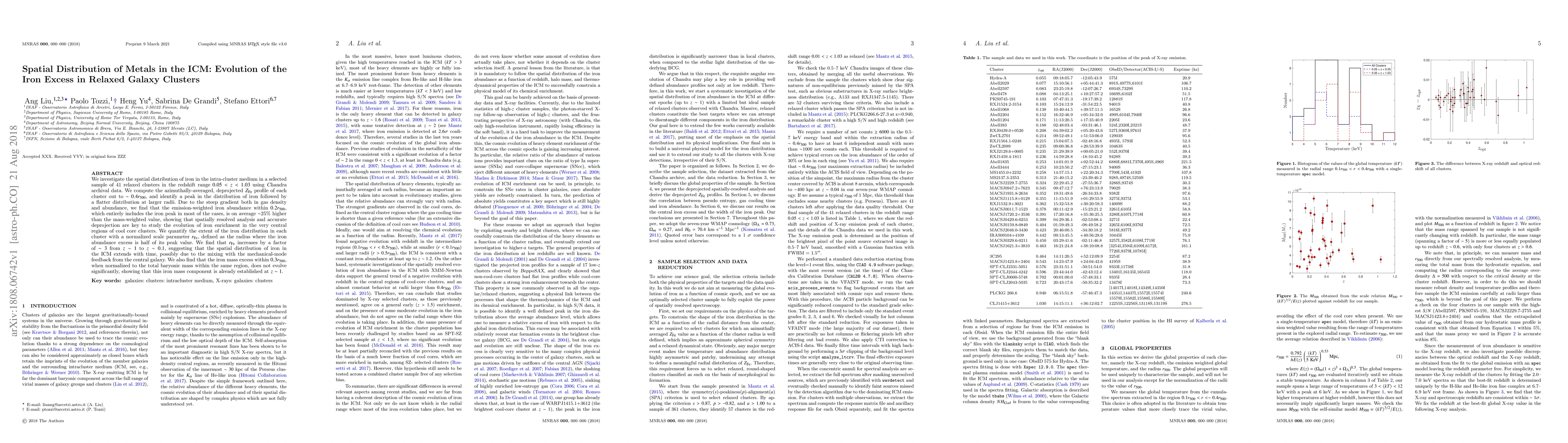 We investigate the spatial distribution of iron in the intra-cluster medium in a selected sample of 41 relaxed clusters in the redshift range $0.05 < z < 1.03$ using {\sl Chandra} archival data. We compute the azimuthally-averaged, deprojected $Z_{\rm Fe}$ profile of each cluster out to $\sim 0.4r_{500}$, and identify a peak in the distribution of iron followed by a flatter distribution at larger radii. Due to the steep gradient both in gas density and abundance, we find that the emission-weighted iron abundance within $0.2r_{500}$, which entirely includes the iron peak in most of the cases, is on average $\sim$25\% higher than the mass-weighted value, showing that spatially resolved analysis and accurate deprojection are key to study the evolution of iron enrichment in the very central regions of cool core clusters. We quantify the extent of the iron distribution in each cluster with a normalized scale parameter $r_{\rm Fe}$, defined as the radius where the iron abundance excess is half of its peak value. We find that $r_{\rm Fe}$ increases by a factor of $\sim 3$ from $z\sim 1$ to $z\sim 0.1$, suggesting that the spatial distribution of iron in the ICM extends with time, possibly due to the mixing with the mechanical-mode feedback from the central galaxy. We also find that the iron mass excess within $0.3r_{500}$, when normalized to the total baryonic mass within the same region, does not evolve significantly, showing that this iron mass component is already established at $z\sim 1$.