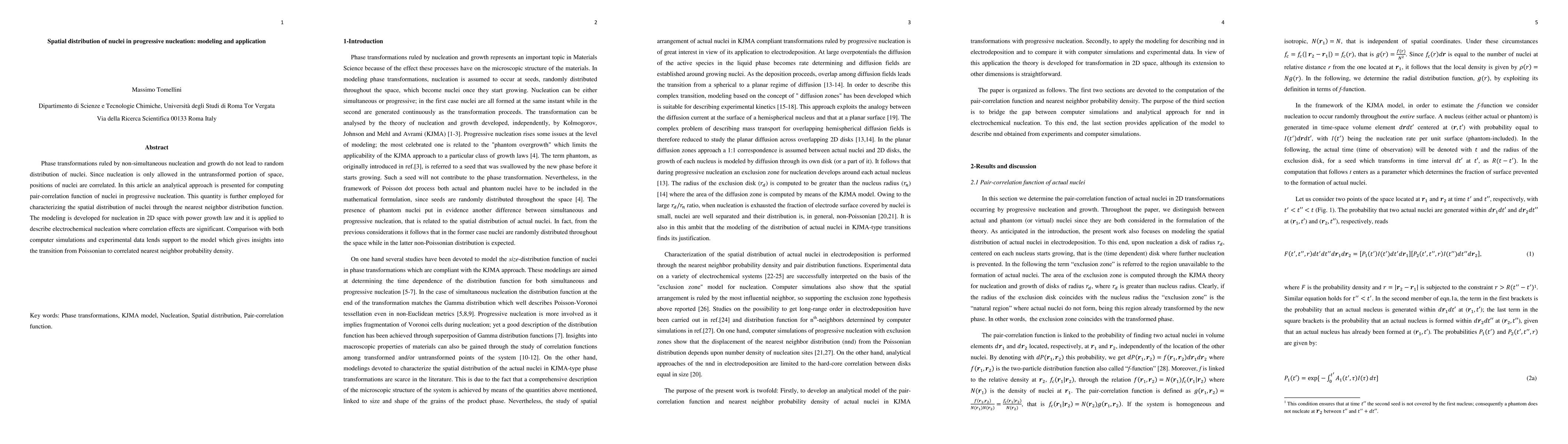 Phase transformations ruled by non-simultaneous nucleation and growth do not lead to random distribution of nuclei. Since nucleation is only allowed in the untransformed portion of space, positions of nuclei are correlated. In this article an analytical approach is presented for computing pair-correlation function of nuclei in progressive nucleation. This quantity is further employed for characterizing the spatial distribution of nuclei through the nearest neighbor distribution function. The modeling is developed for nucleation in 2D space with power growth law and it is applied to describe electrochemical nucleation where correlation effects are significant. Comparison with both computer simulations and experimental data lends support to the model which gives insights into the transition from Poissonian to correlated nearest neighbor probability density.